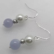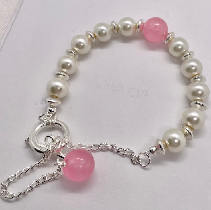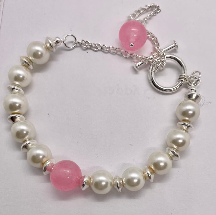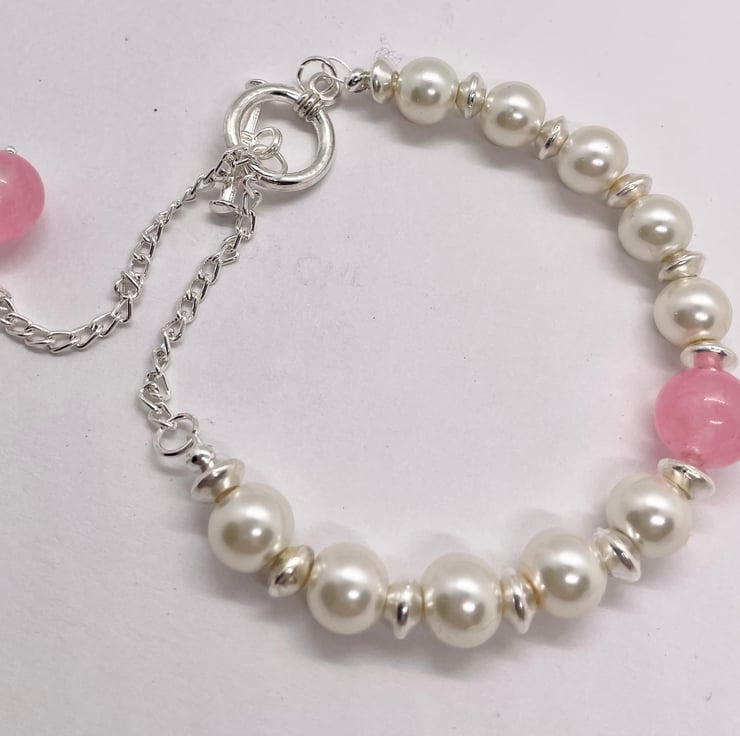 Glass pearl and rose pink dyed jade beads bracelet with silver plated beads and chain with clasp.