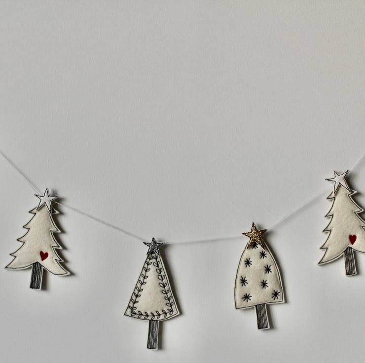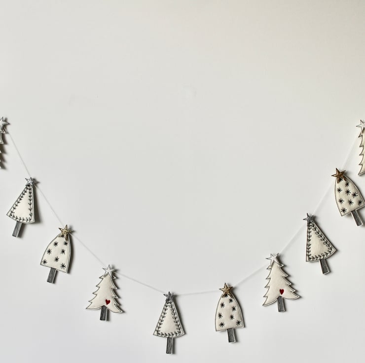 Each of the twelve trees suspended along this garland, are sewn using a combination of 100% wool felt, glitter cloth and free hand machine embroidery; multiple layers of cloth are sewn together and cut out by hand using very sharp scissors.