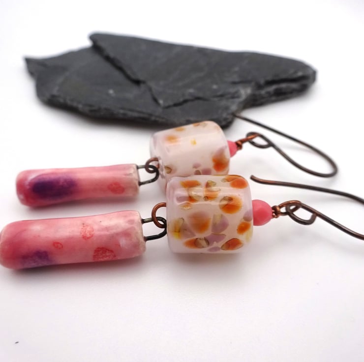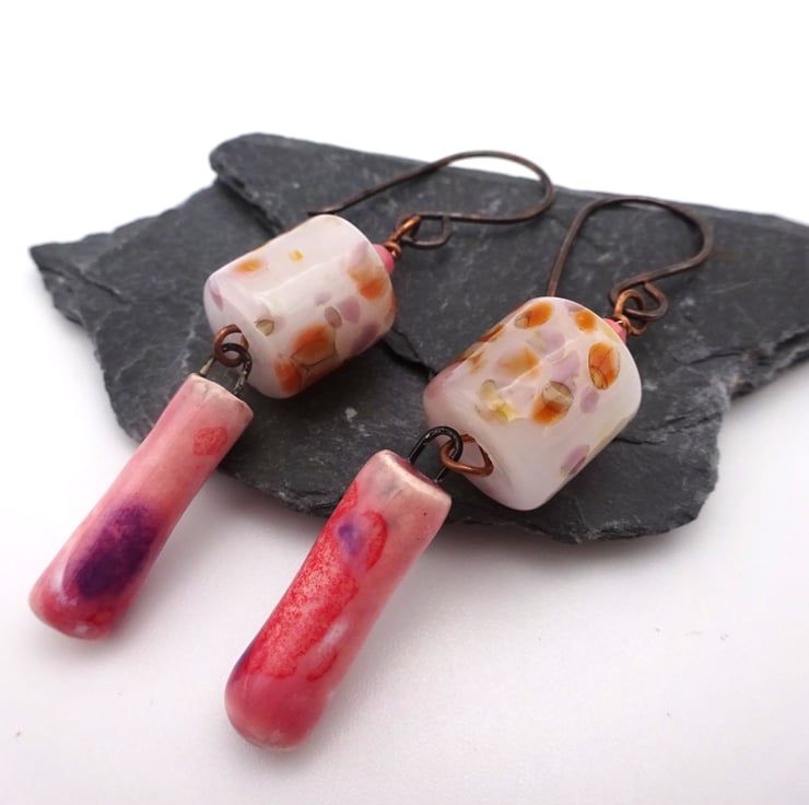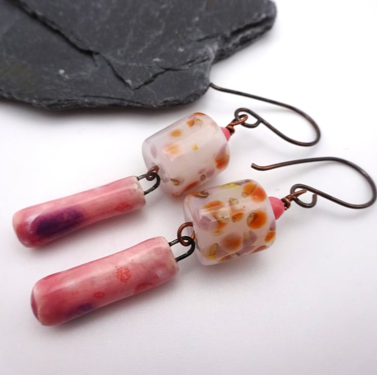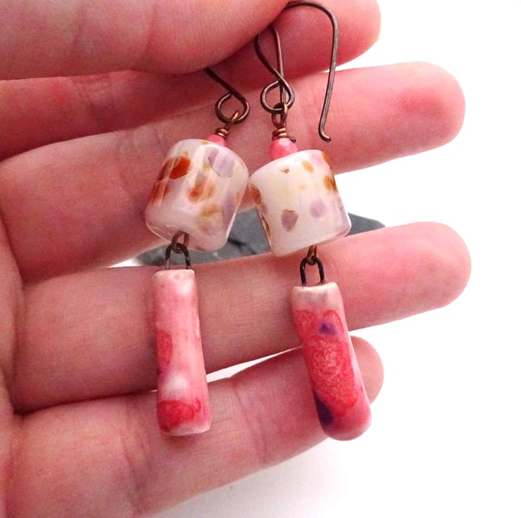 A pair of earrings made with handmade copper ear wires, handmade white and pink speckled lampwork glass beads and handmade pink ceramic tube charms.