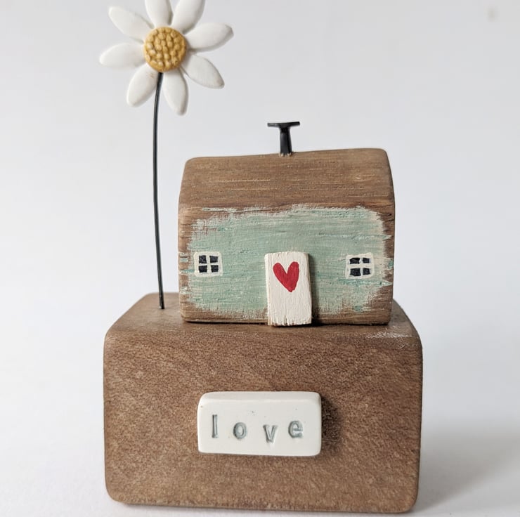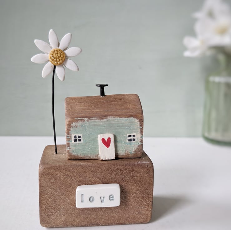 This is one of my little houses, sitting on a lovely reclaimed wooden block. A jolly flower finishes the scene.