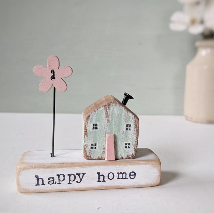 A hand stamped wooden base with a teeny painted house and a jolly flower on a wire to stand beside it.