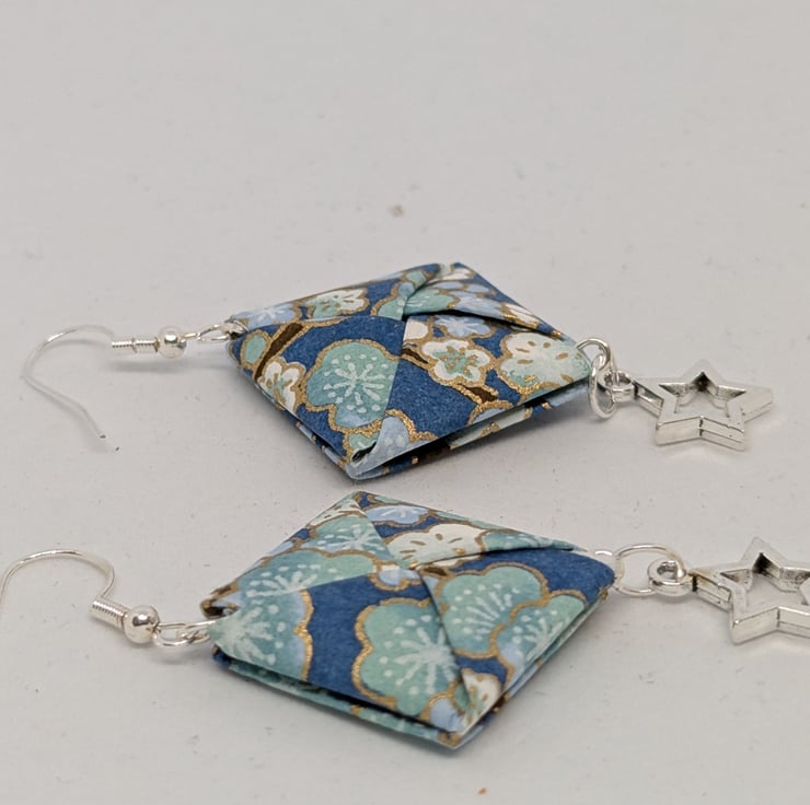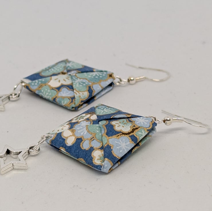 These unique earrings have been created with traditional Japanese washi paper with an elegant pattern of plum tree flowers in white and blue, on a turquoise background. The paper has been folded using origami techniques with the addition of small star-shaped charms to create earrings which are 5cm in length, with sterling silver ear hooks. Hand crafted and designed in Glasgow, Scotland, these earrings would be a great addition to any collection. A perfect and unique choice for a first wedding anniversary gift!