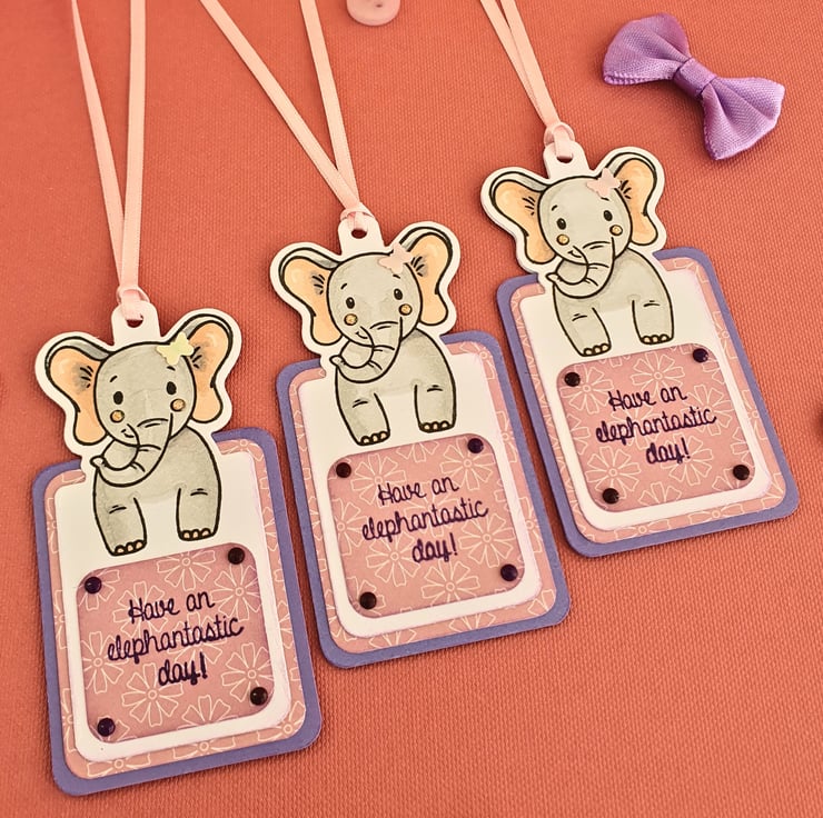 Both the front & back of the elephant figure are stamped on a white smooth card & hand coloured with alcohol markers. The two parts come together with a panel of purple cardstock layered with pink, patterned thick paper on either side, to provide a very sturdy tag that will stay nice and firm. On the front, a smaller panel of the pink patterned paper is stamped with the sentiment "Have An Elephantastic Day" and is embellished with matching small craft gems on the four corners. A butterfly embellishment is placed on one of the elephant's ears, to add extra cuteness!