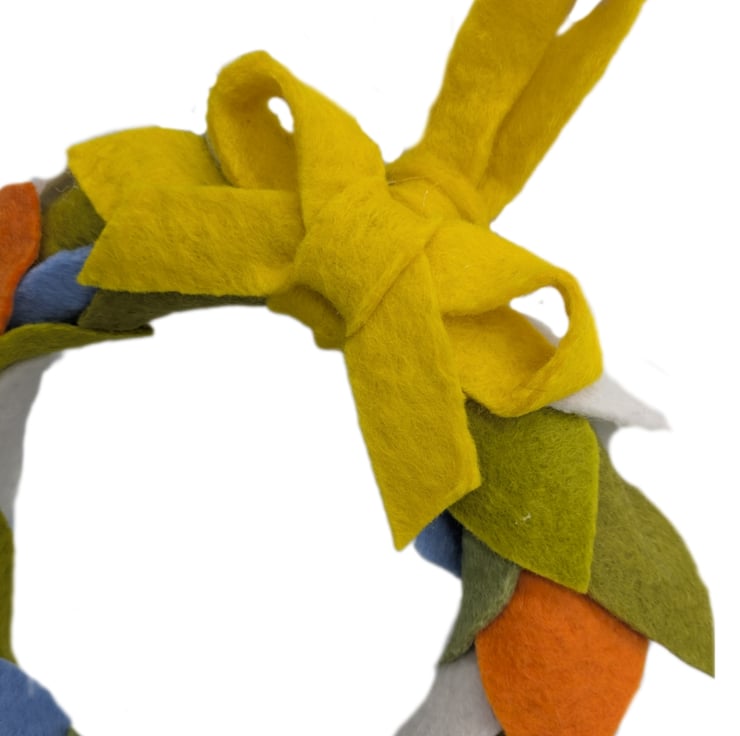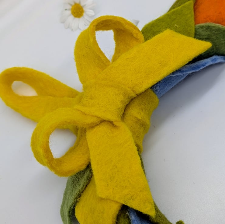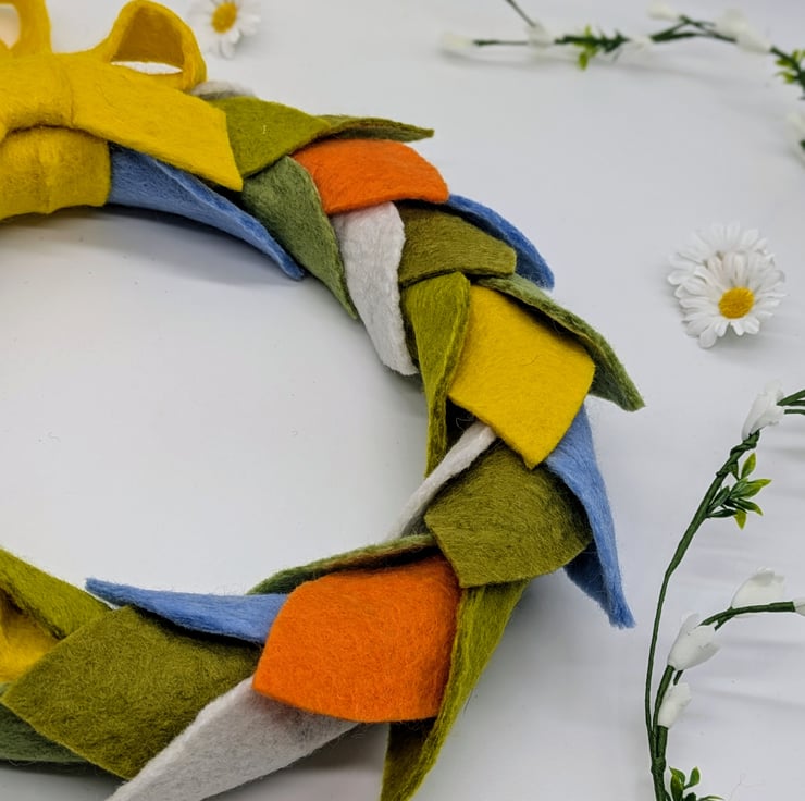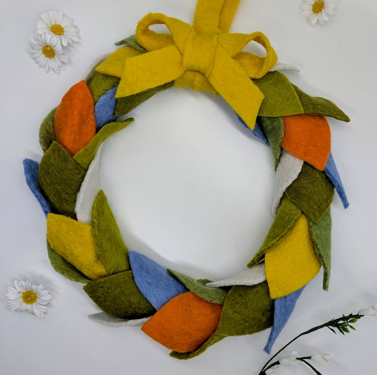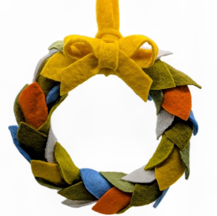 This wreath is made by hand dyed, wet felted British wool. Lovingly but together on a wooden twig ring and finished with a hand tied wool bow and hanging.