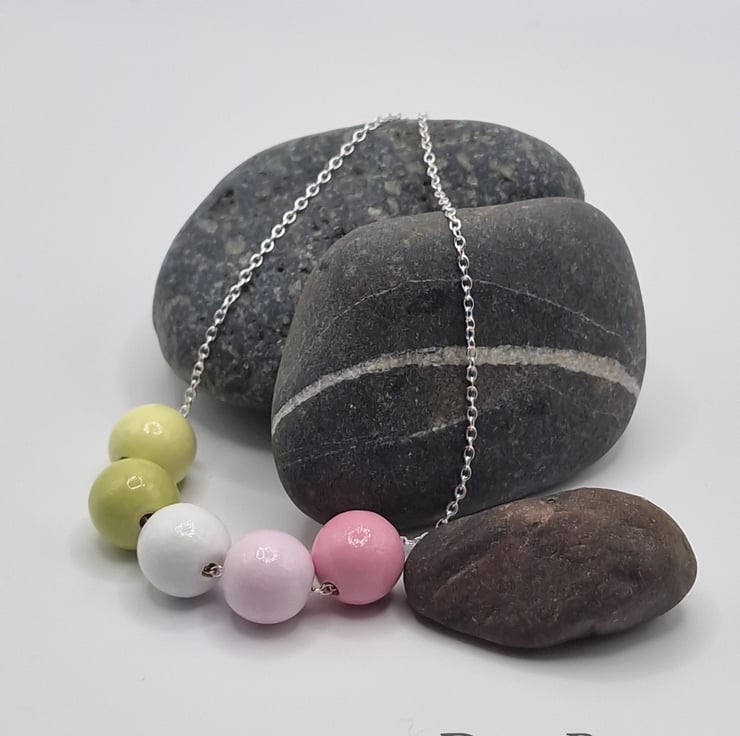 5 hand painted wooden beads (which are from a sustainable source) on a 18" recycled sterling silver necklace