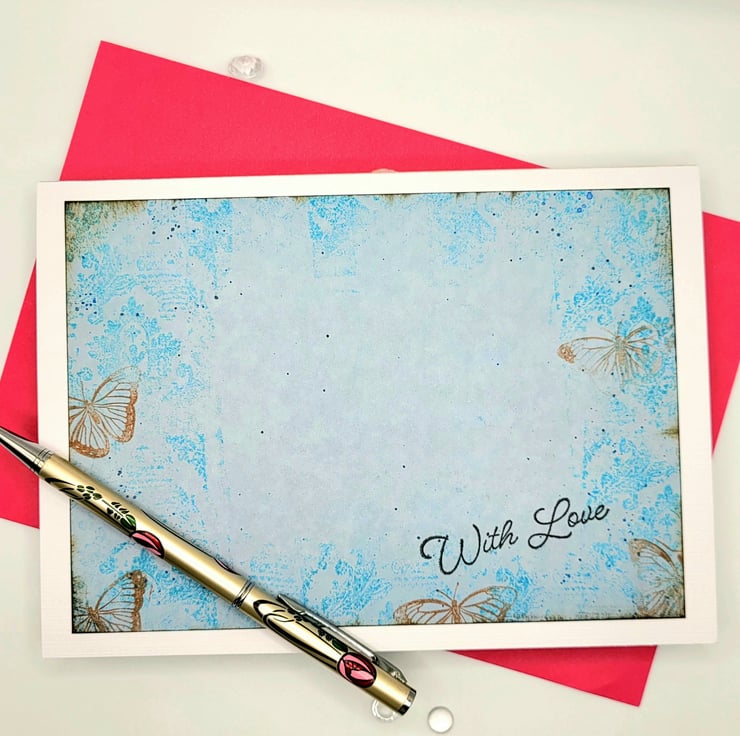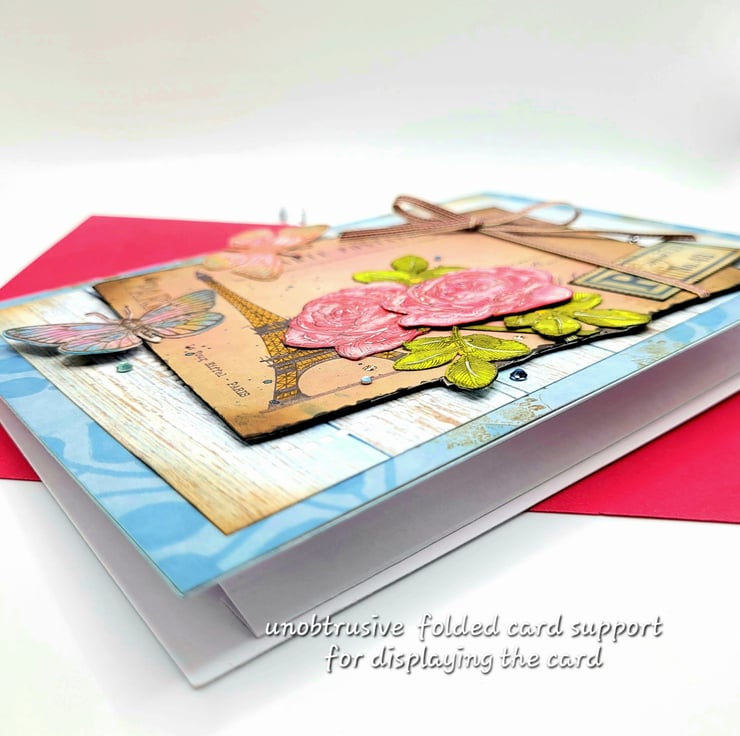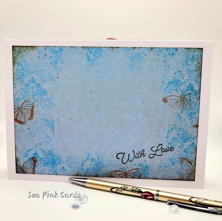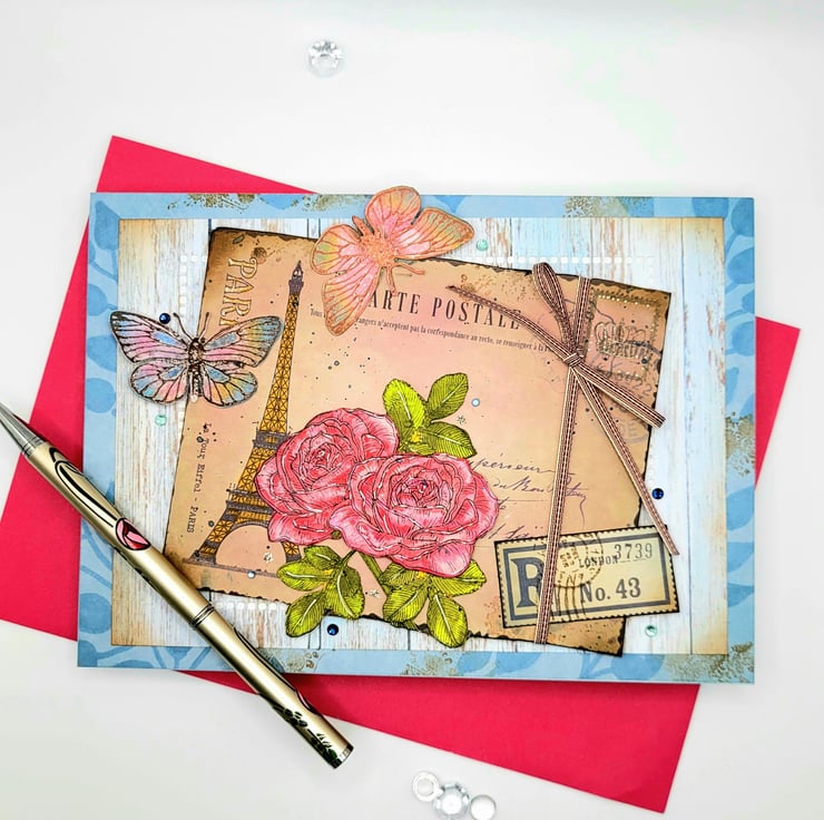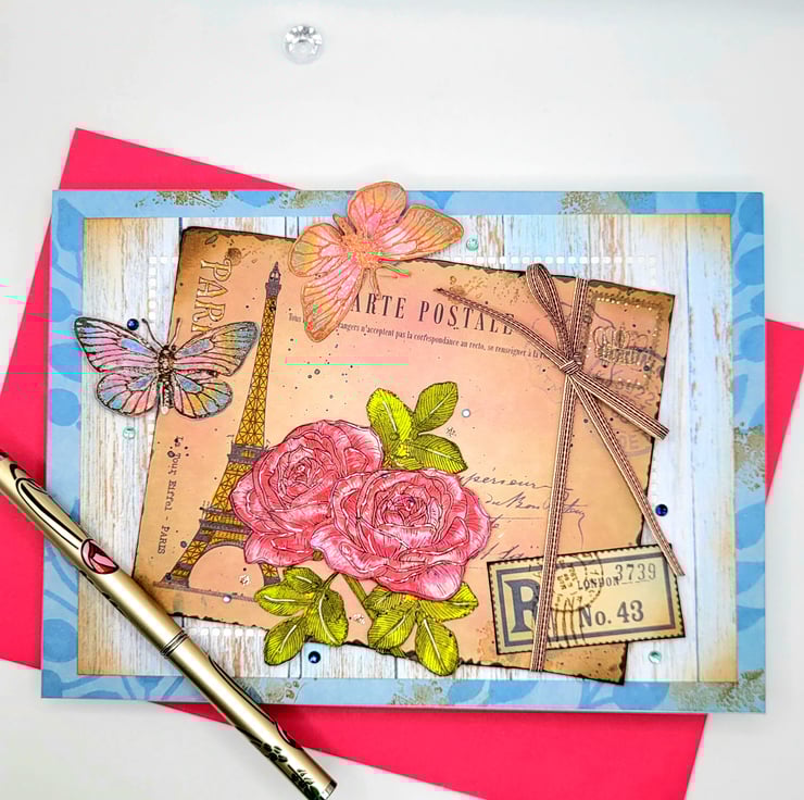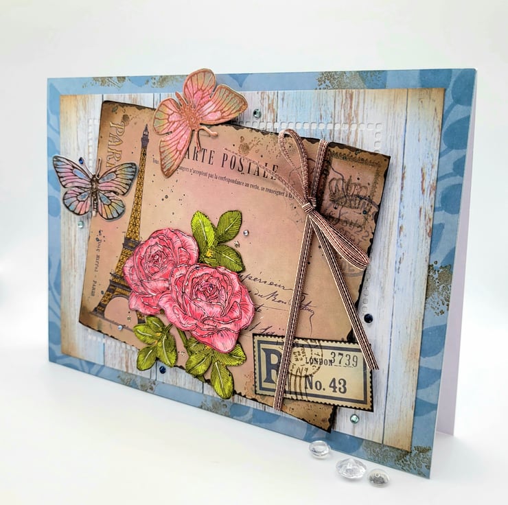 A detailed blank card for any occasion, that is specially made to keep and display. I was inspired by vintage postcards and have incorporated this idea into the design. The roses are stamped, coloured and cut out by hand. The two little butterflies are stamped then heat embossed for texture. There is a layer of blue card which I stamped with leaves and a layer of wood-grain style paper with a die-cut detail. There is a faux postcard with additional stamping.