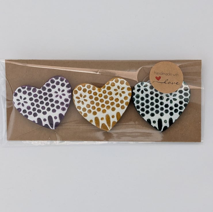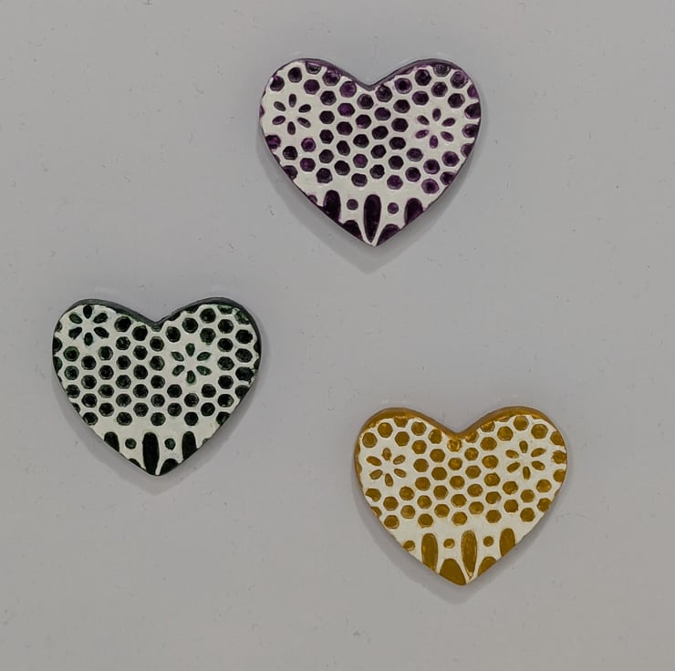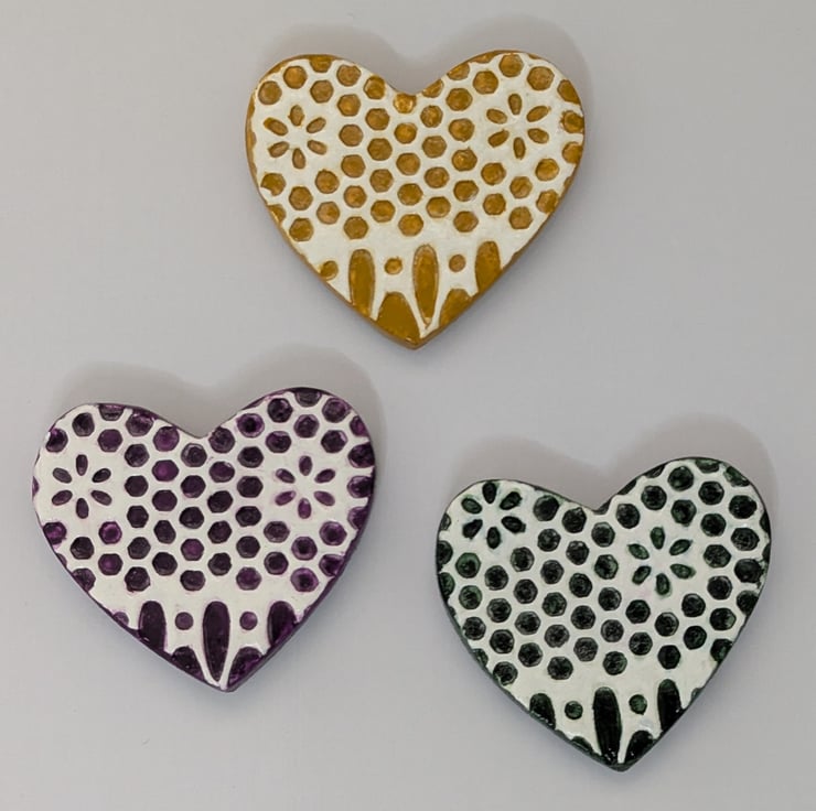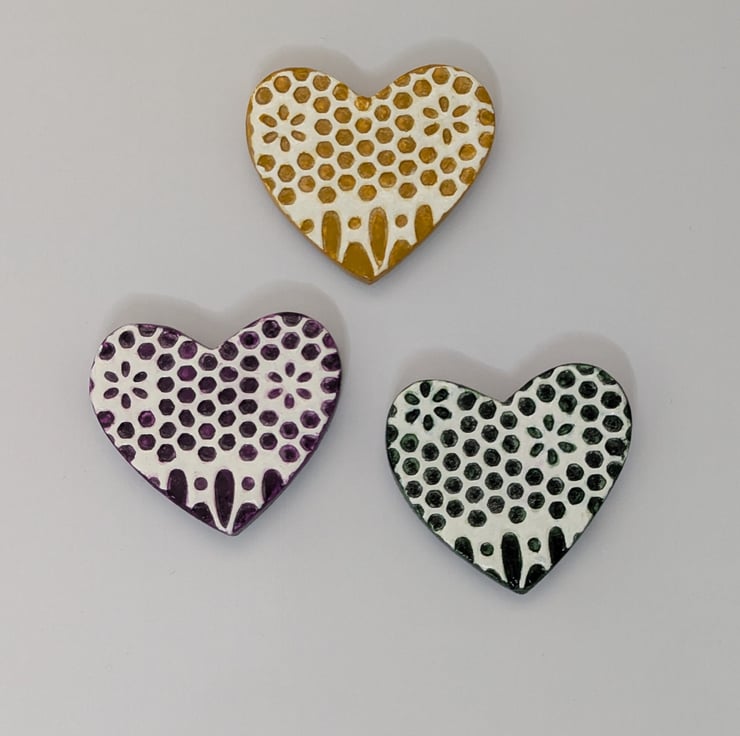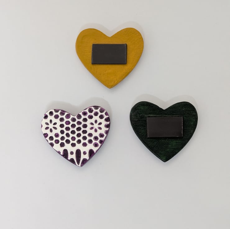 Set of 3 clay heart fridge magnets which have been handmade from air dry clay, embossed with a lace pattern and painted with acrylics in oriental violet, yellow ochre and Hooker's green. These pretty hearts have been sealed with varnish and a strip magnet has been added to the back of each. They would make a bright addition to your kitchen fridge or can be attached to any surface with magnetic properties.