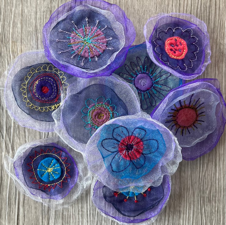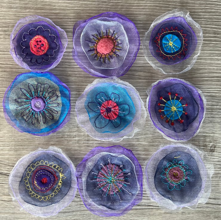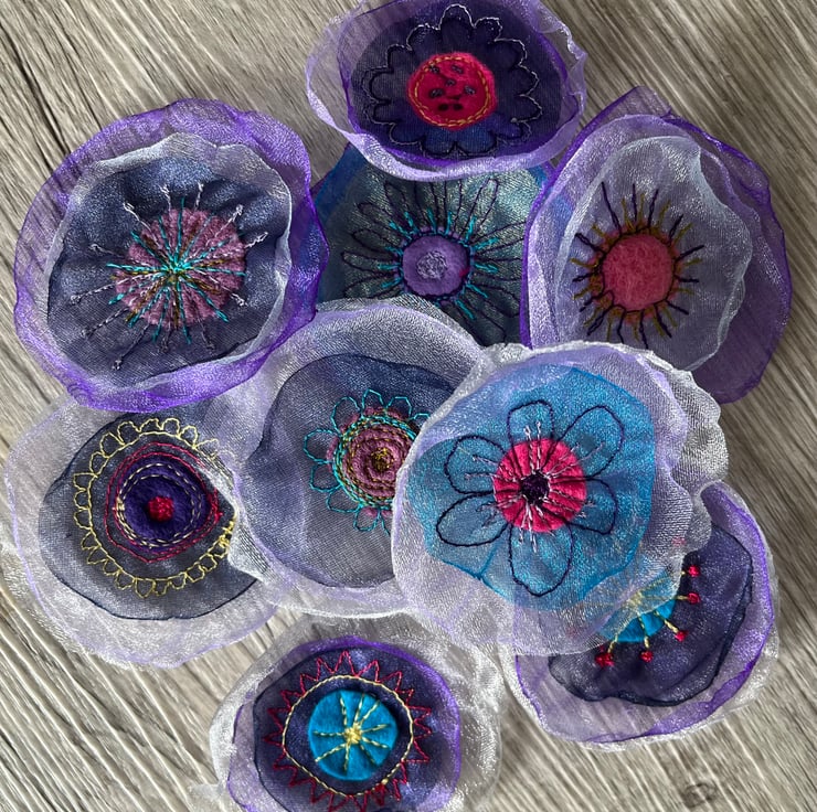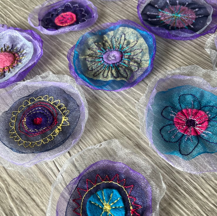 Each one is made of 3 layers of organza, a centre of felt and embroidery thread which has been free motion embroidered to add detail.