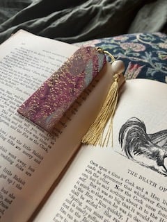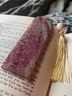 Handmade, multi colour (pink, blue,brown), with a pretty gold fleck, polymer clay bookmark, with a light golden silky tassel and white wooden bead.