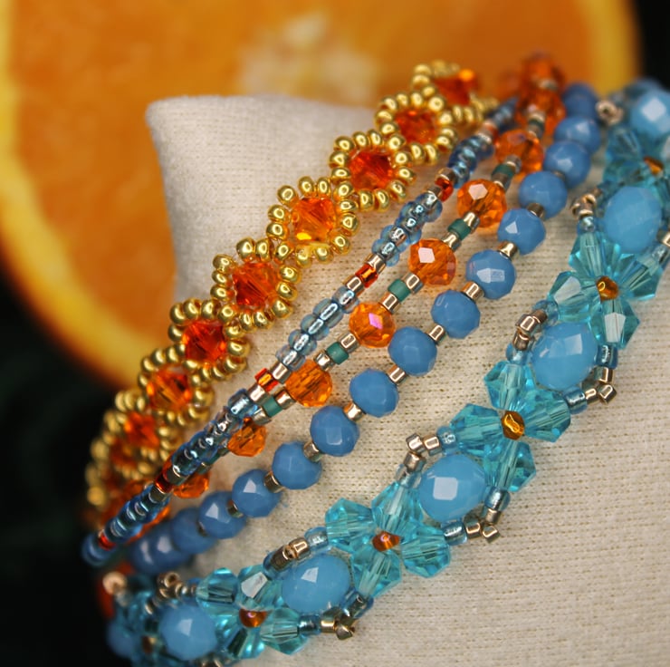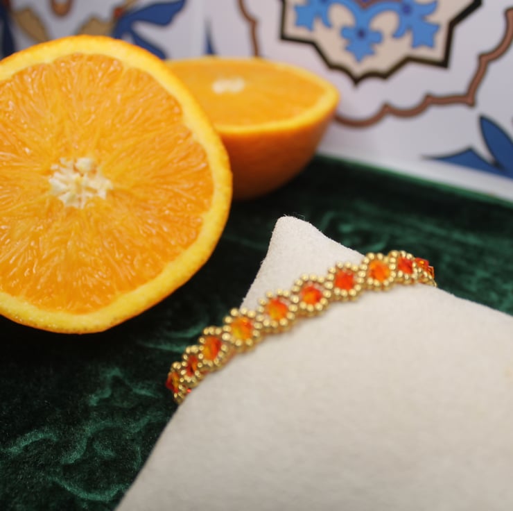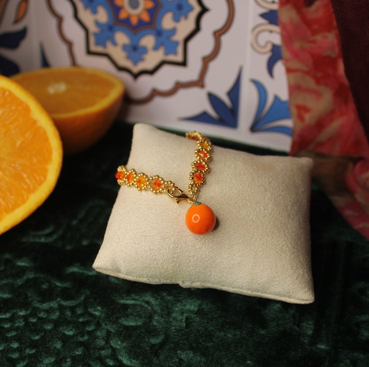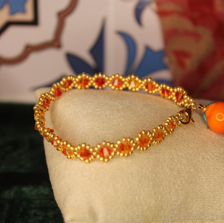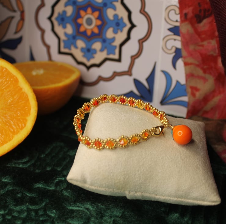 Infused with the vibrant spirit of Seville, this exquisite bracelet is a celebration of colour and elegance. Handcrafted with brilliant orange Swarovski crystals and golden seed beads, it catches the light beautifully, adding a radiant glow to your wrist.