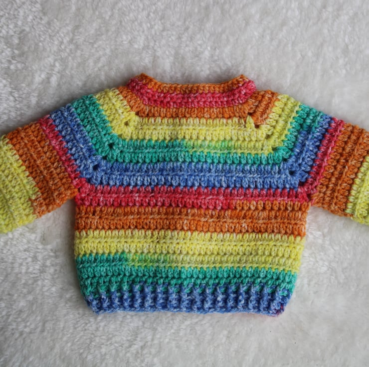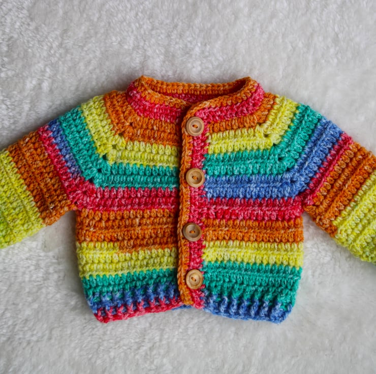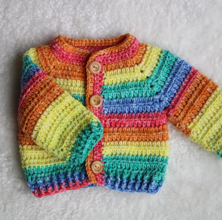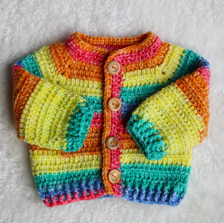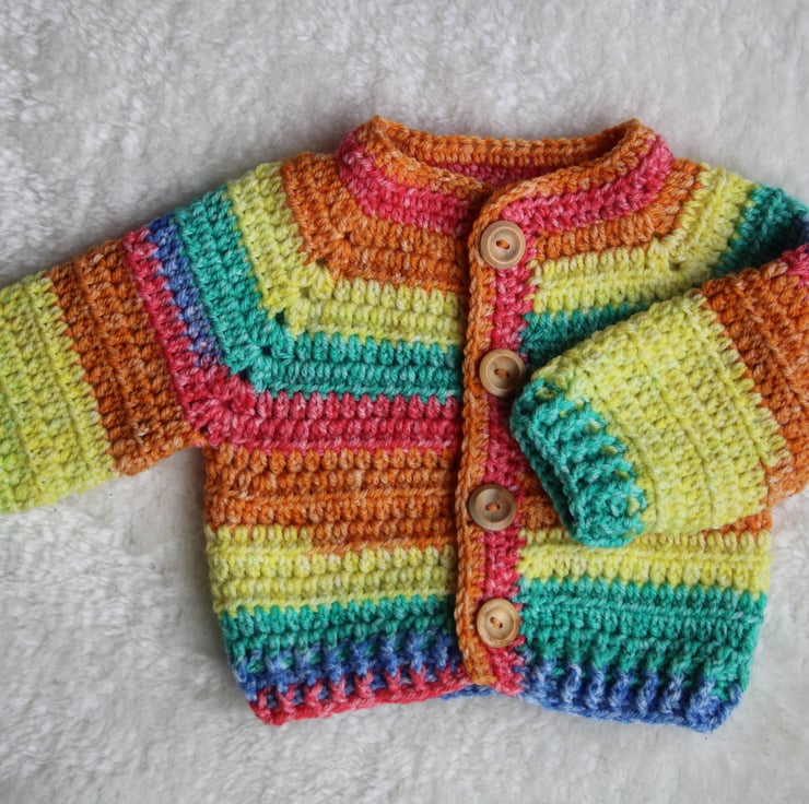 A brightly rainbow coloured, long sleeved cardigan for a new baby girl or a new baby boy.