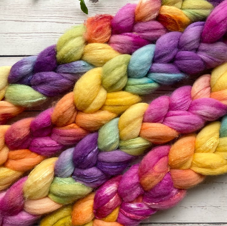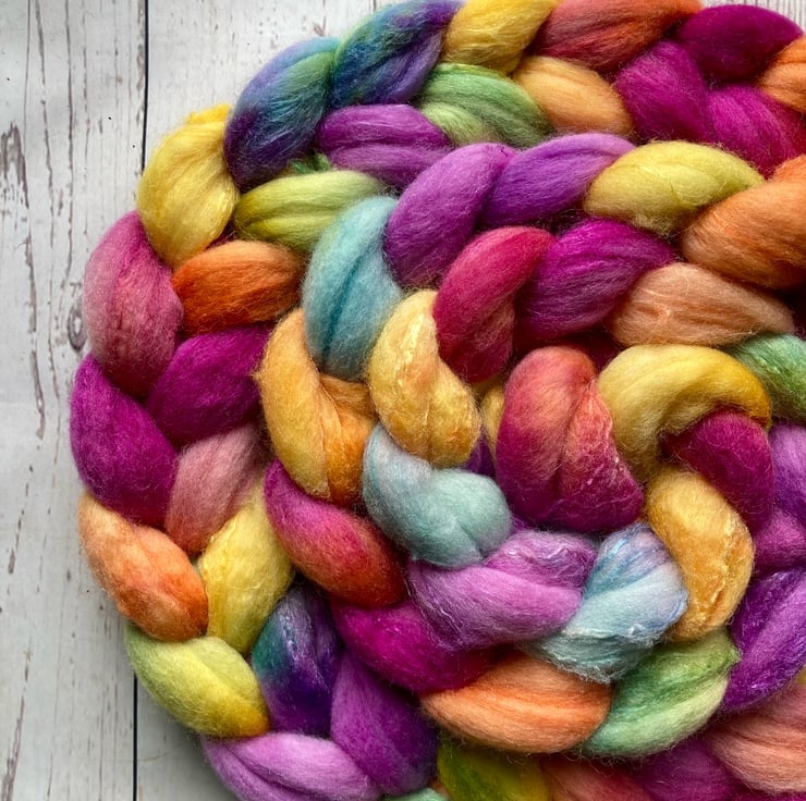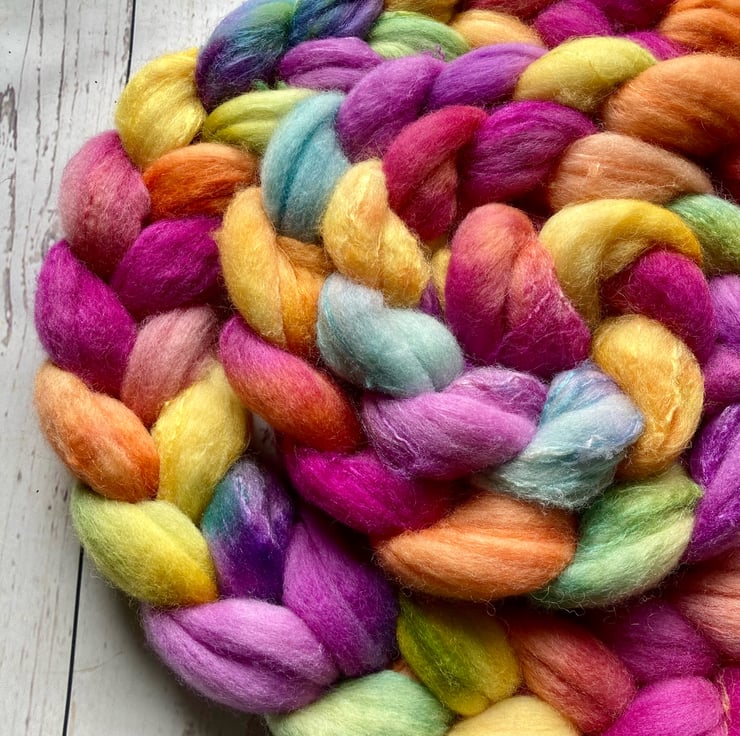 This is a special blend of Falkland, Cormo, Corriedale, BFL and silk. All are wools favoured for spinning and felting among fibre enthusiasts and artisans. When it comes to spinning this blend, the fine and soft fibres make it a joy to work with on spinning wheels or drop spindles.