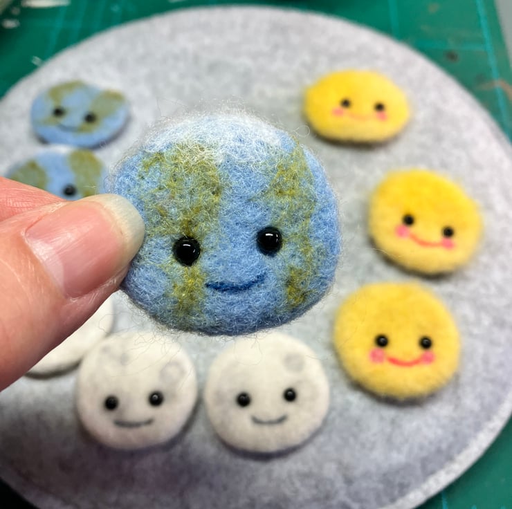 Hand felted 4cm smiley wool world with butterfly pin fixing , bead eyes