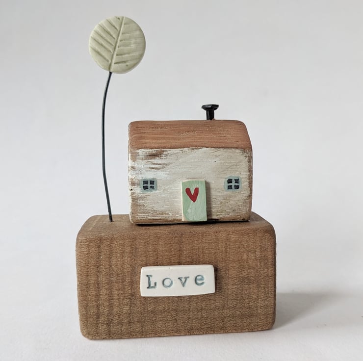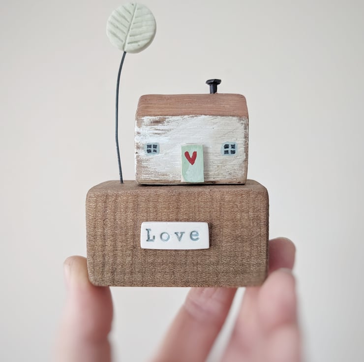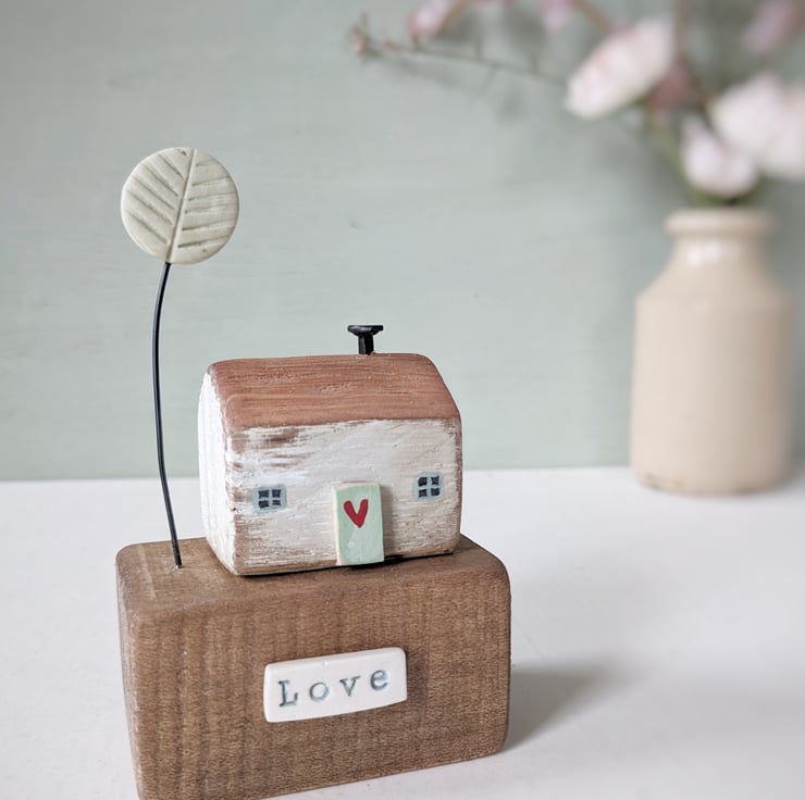 This is one of my little houses, sitting on a lovely reclaimed wooden block. A jolly handmade clay tree finishes the scene.