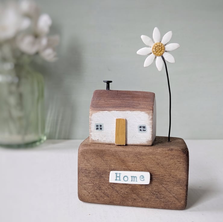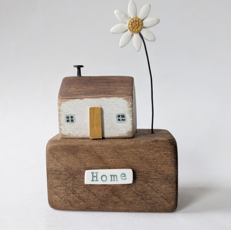 This is one of my little houses, sitting on a lovely reclaimed wooden block. A jolly flower finishes the scene.