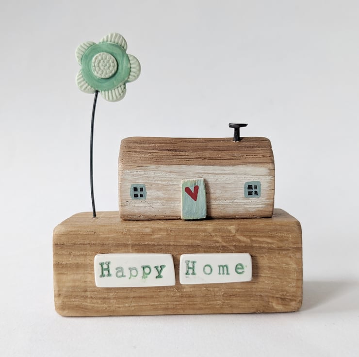 This is one of my little houses, sitting on a lovely reclaimed wooden block. A jolly handmade clay tree finishes the scene.