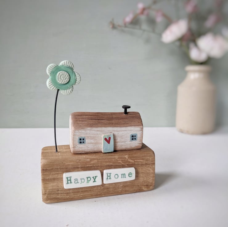 This sweet little hand-painted house sits atop a wooden block, with a hand painted clay flower above.