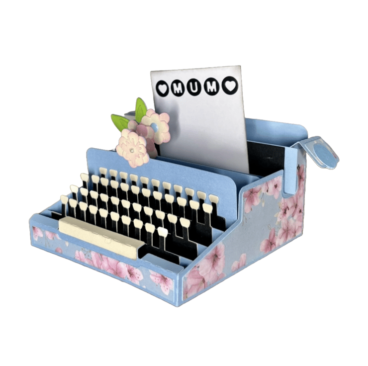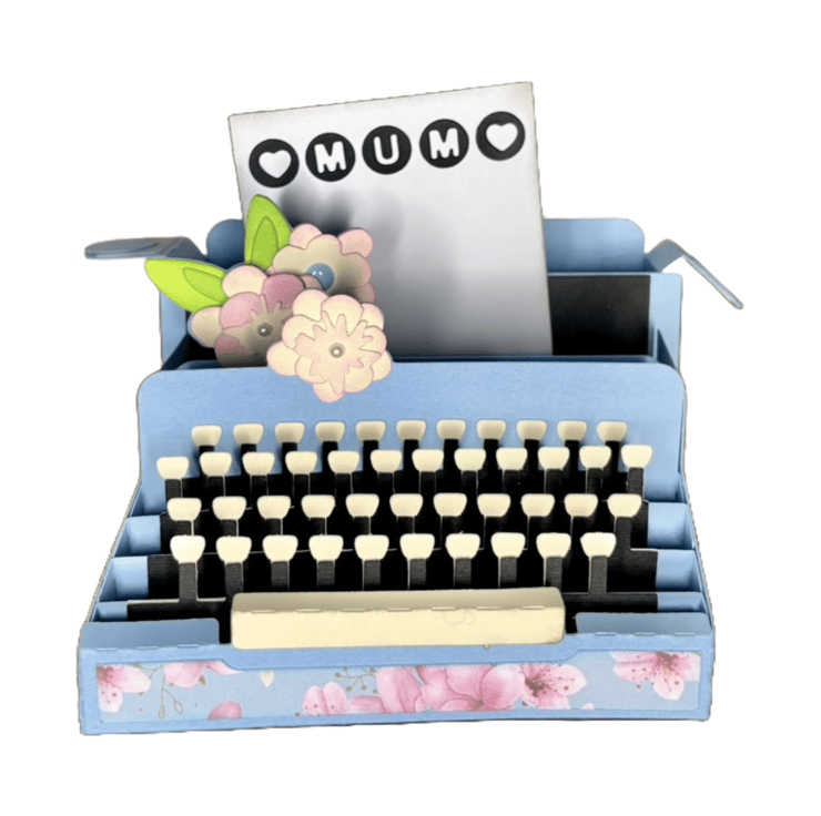Unfold this pop-up card to reveal a charming blue typewriter adorned with floral decorations. The paper emerging from the typewriter spells "MUM" with heart symbols on either side, giving it a warm, vintage feel. The cream-colored keys add a touch of realism, and vibrant paper flowers with green leaves bring a burst of joy.