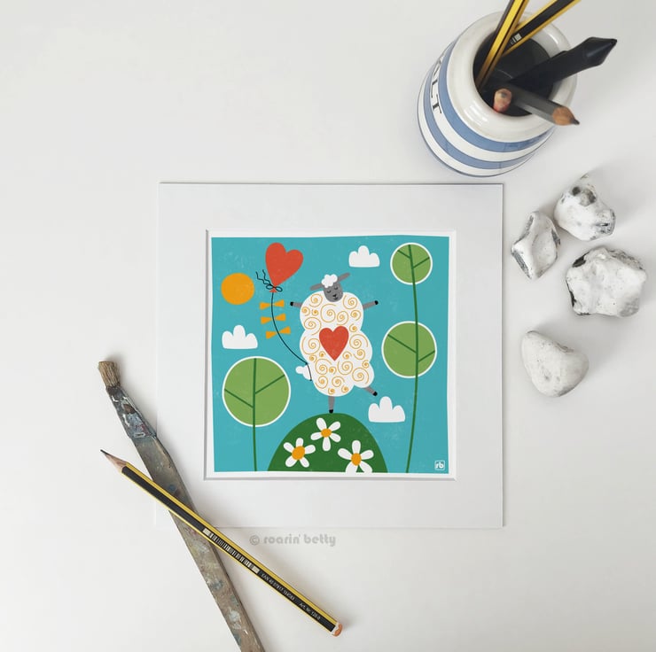 Quirky print of a sheep with a heart shaped balloon. Gift for adult or child who loves sheep.