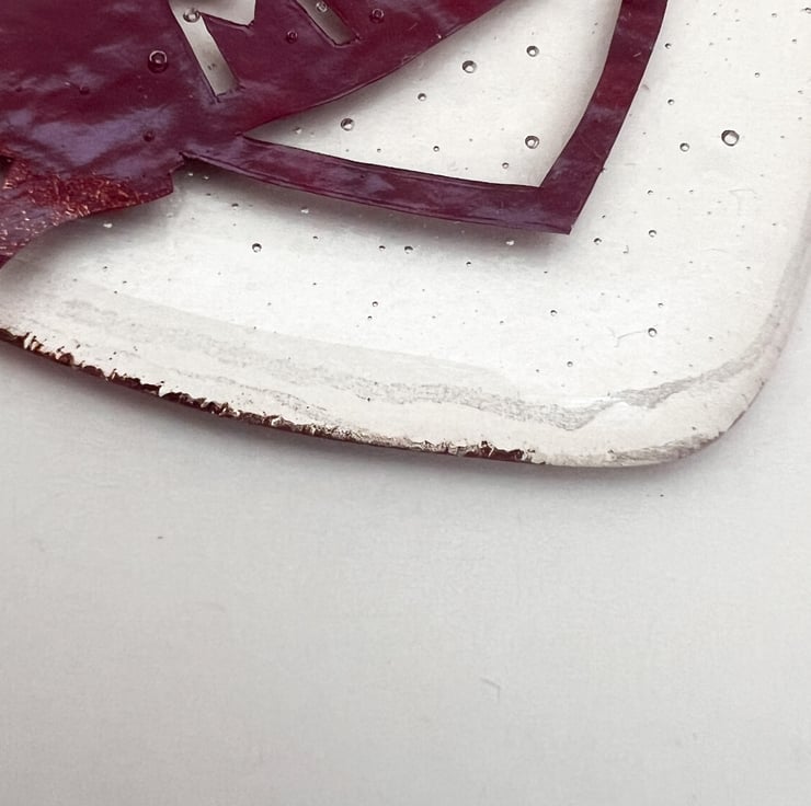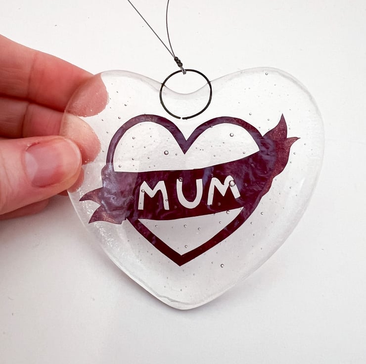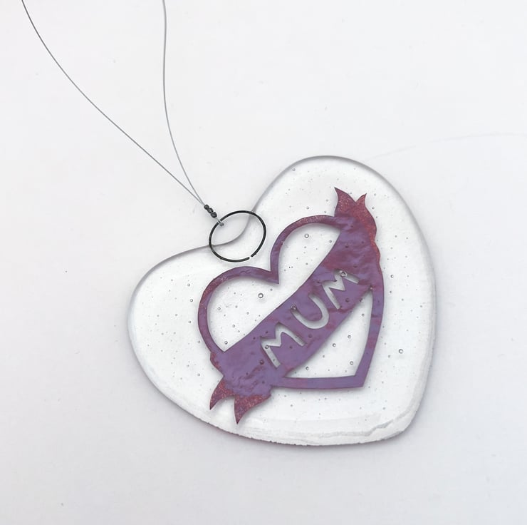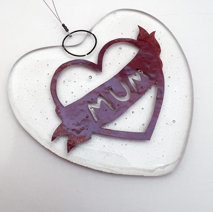 Fused glass hanging suncatcher, in the shape of a heart, with a handcut retro tattoo "Mum" copper foil inclusion inside.