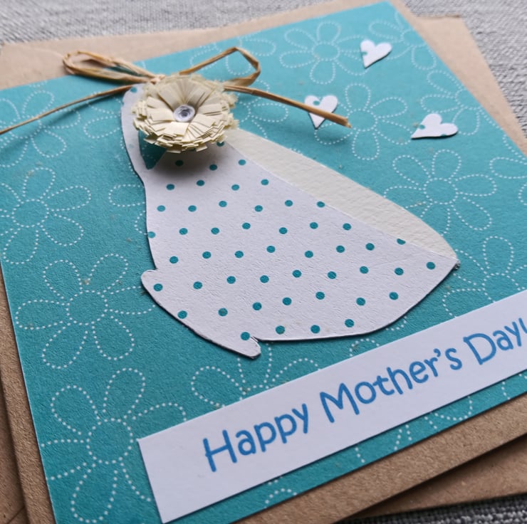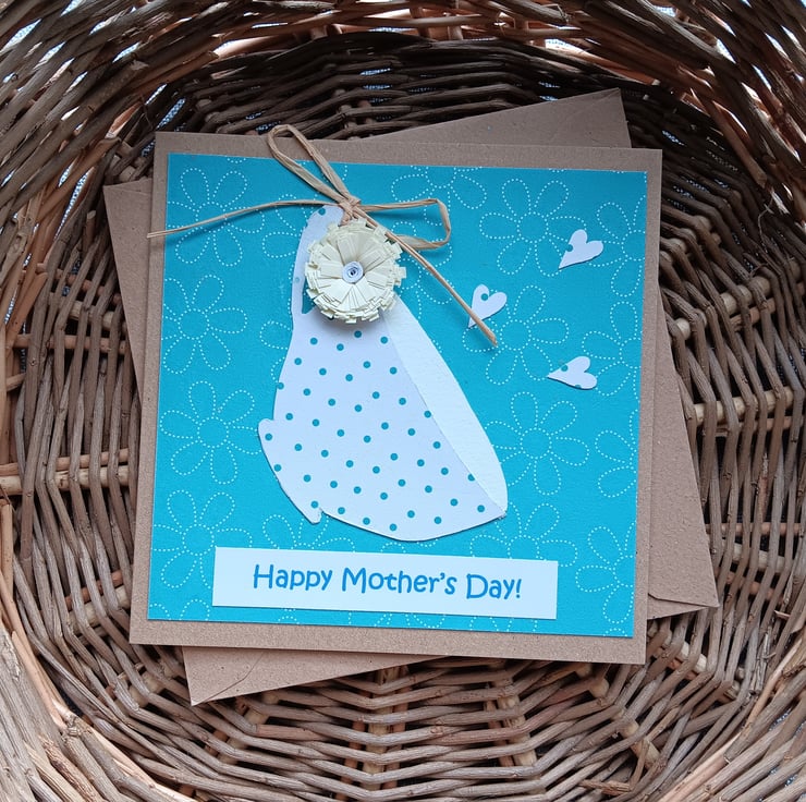 The card is handmade using a brown kraft card, patterned papers, quilling paper and plain raffia (string). The greeting is printed on white card with blue ink. The card is finished with small heart shapes.