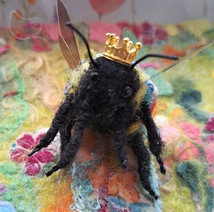 Needle felted and embroidered queen bee, measures approx 3 cm long by 5cm wide .She has a little crown attached to her head.Your bee will come with a fine gold hanging thread ,which can be snipped off if not required,Gift box included.This is actual bee you can purchase.