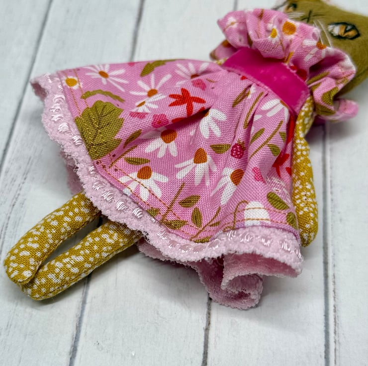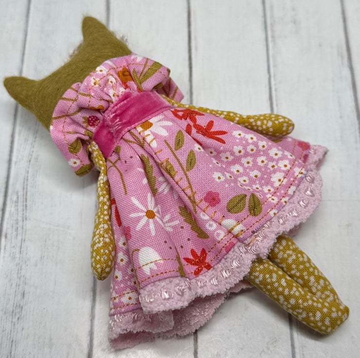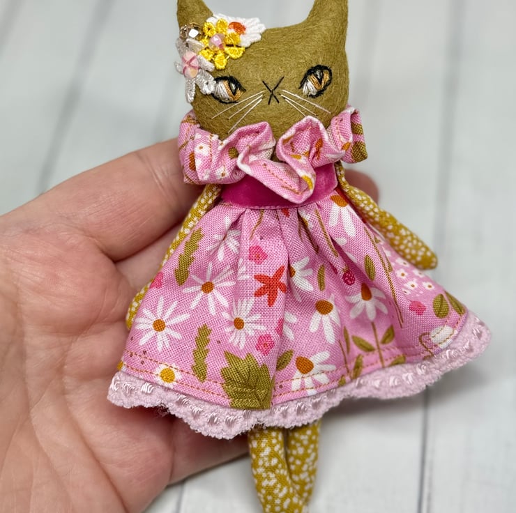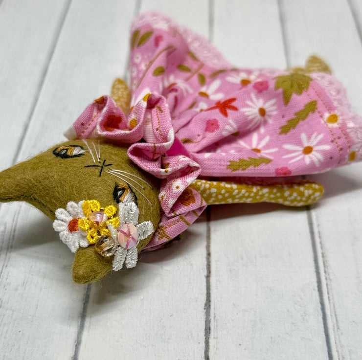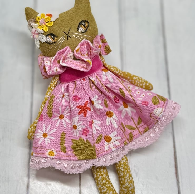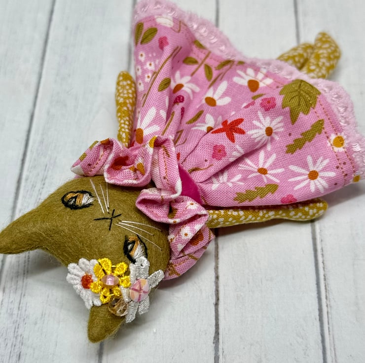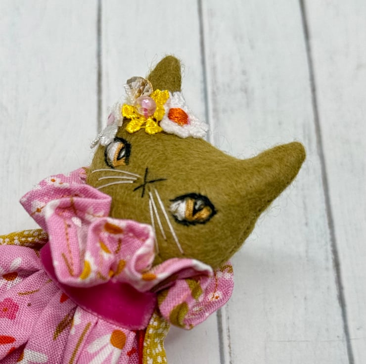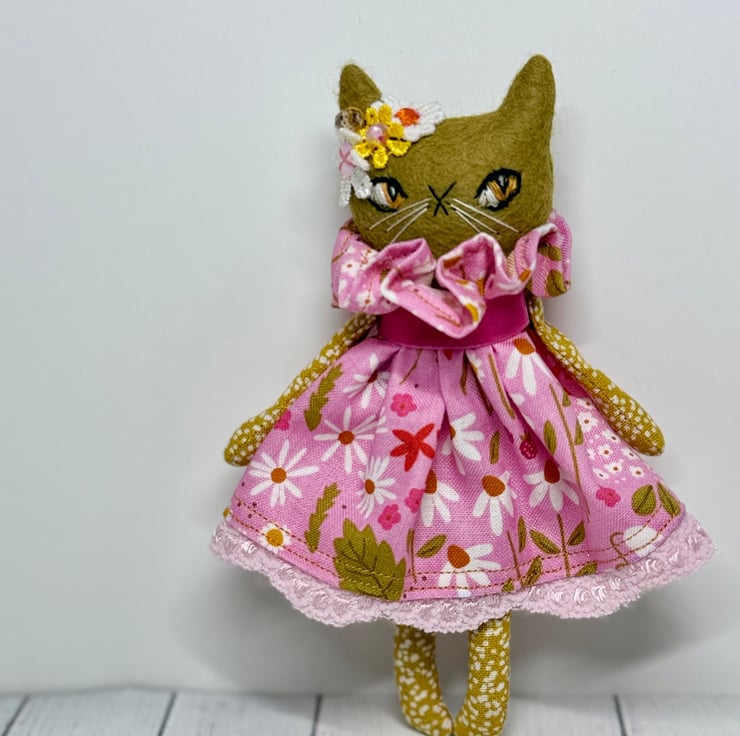 Decorative textile art doll with felt body and hand embroidered face. Kitty wears flowers and beads sewn into place on top of her head. This kitty wears a hand sewn dress with lace trim to the bottom and velvet ribbon around her neck. Kitty measures roughly 14cm tall and can only stand if leaning against something. This is for decorative purposes only and not a toy. Sent in recyclable or recycled packaging.