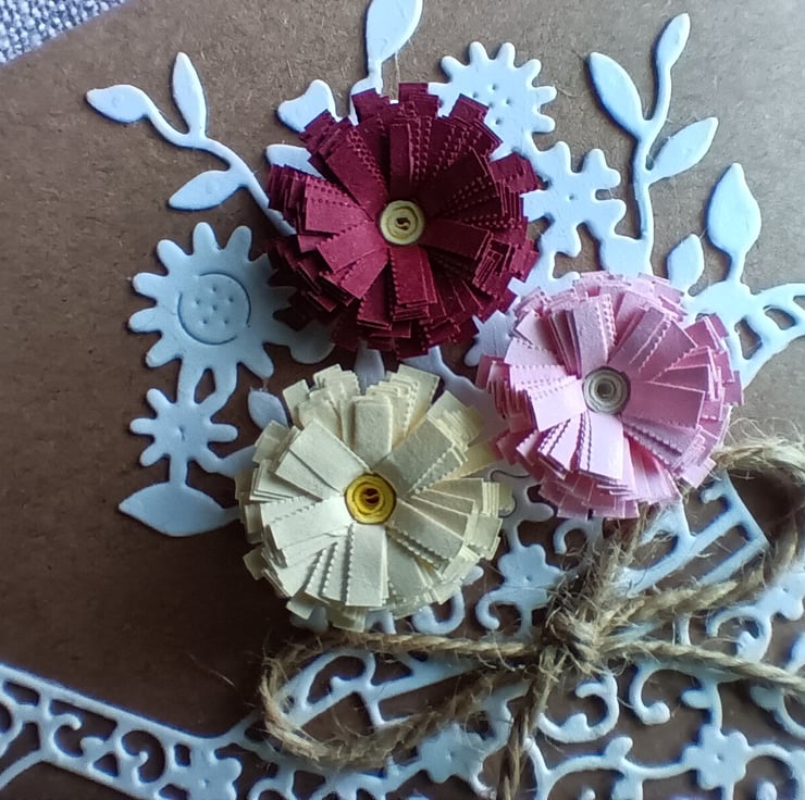 This card is handmade with love and care using quality materials : brown kraft card, paper a tattered lace watering can card topper, strips of quilling paper, deep red card and a string bow. The flowers are handmade using strips of paper, a slotted tool and scissors. The card is left blank inside and comes with a red envelope. The words are printed on white card in red ink. All my quilled cards are raised due to the 3D nature of quilling so if posted you need to bear in mind that the postage will be for a large letter. There is only one exactly the same available so it is truly unique.