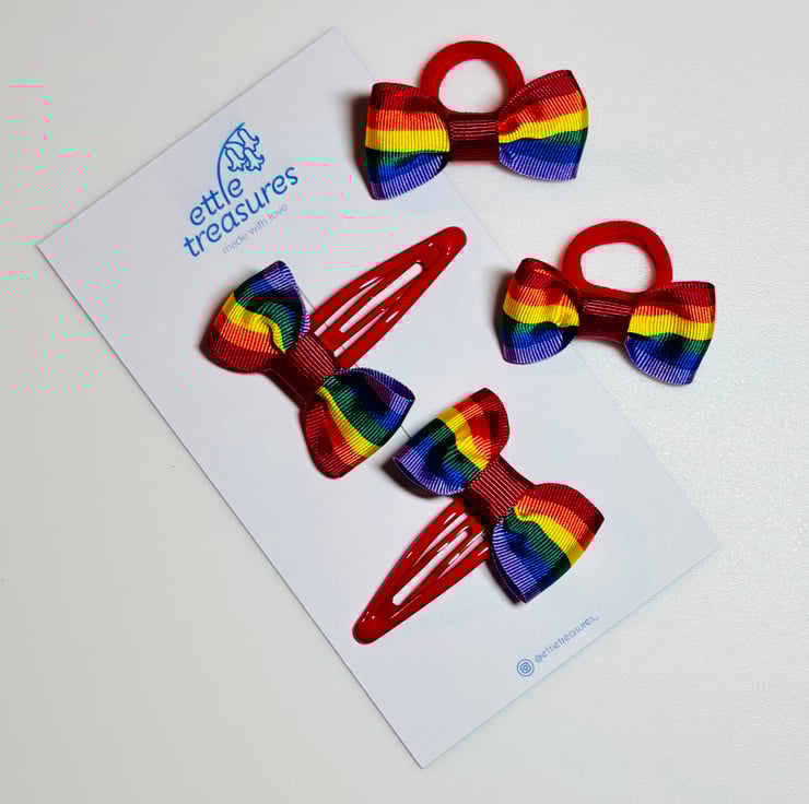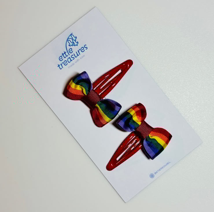 Handmade Grosgrain rainbow ribbon bows, set on Red snap clips.