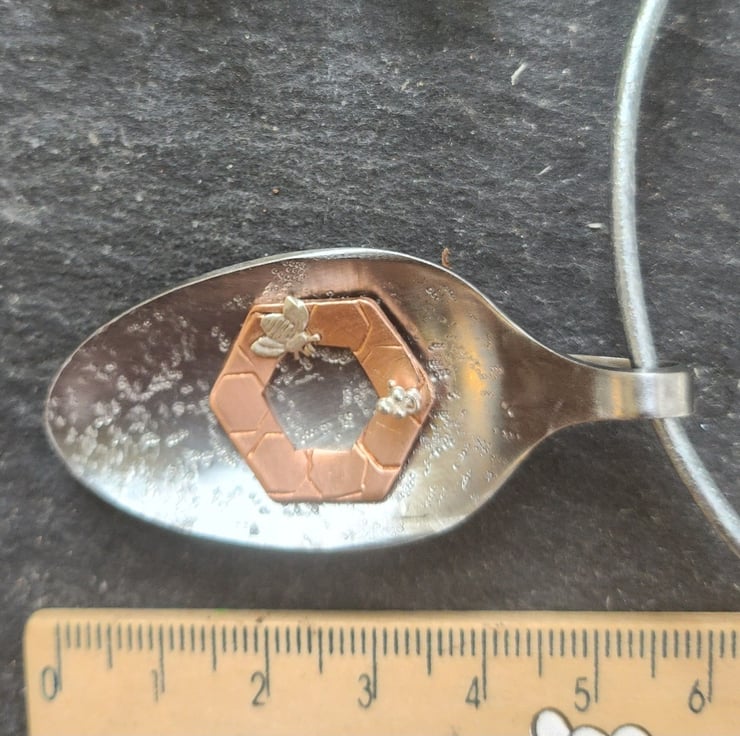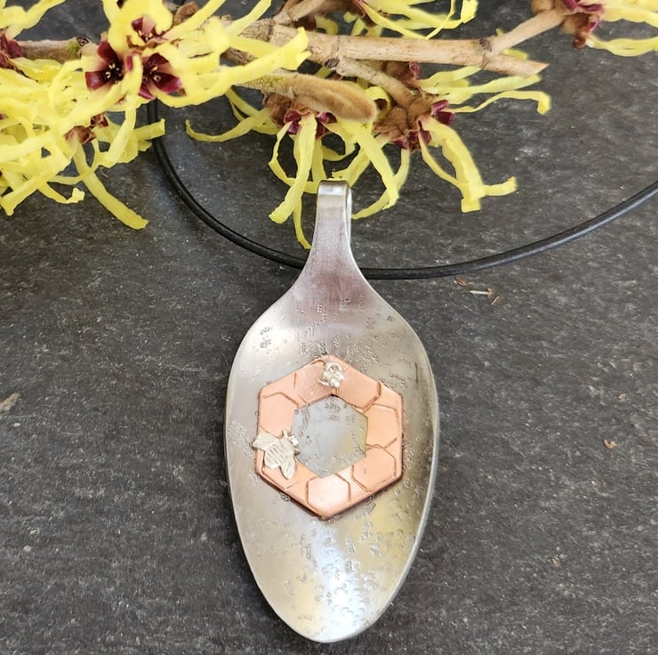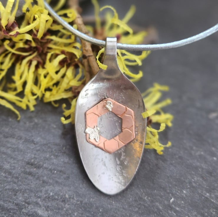 An upcycled textured silver plated teaspoon. Attached to this is a copper honeycomb shape with knotted sterling silver wire. A sterling silver little bee accent is soldered onto the honeycomb.