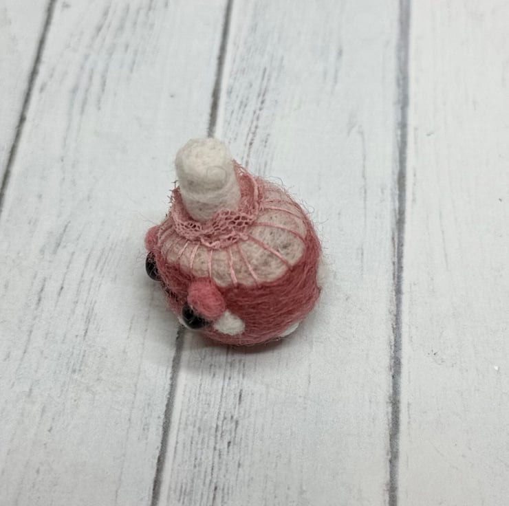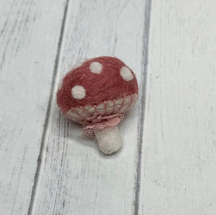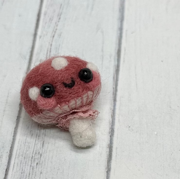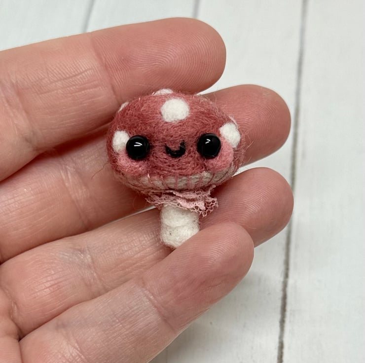 A tiny needle felled mushroom with dusky pink cap and off white spots. Mushroom has glass bead eyes and rosy cheeks with hand embroidered gills and ruffled ribbon atop the stem. Measures roughly 3cm tall and comes with transparent loop hanger. This is for decorative purposes only and not a toy. Tracking available in separate listing.