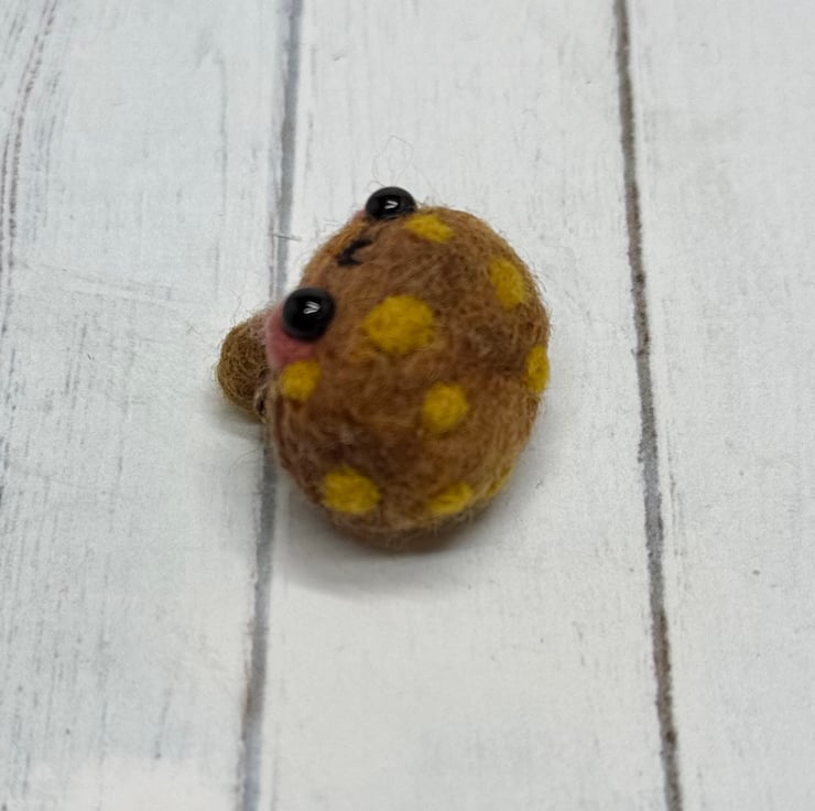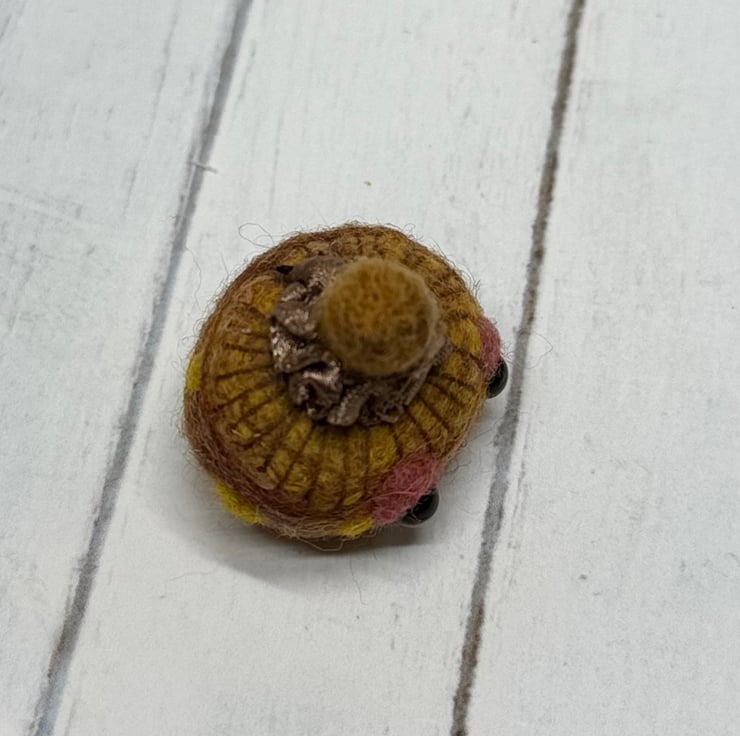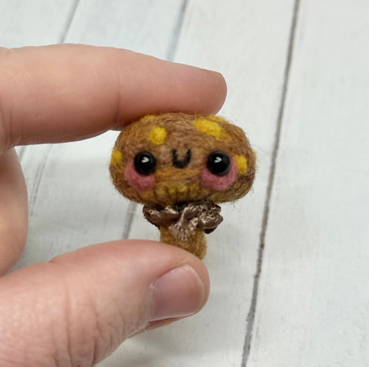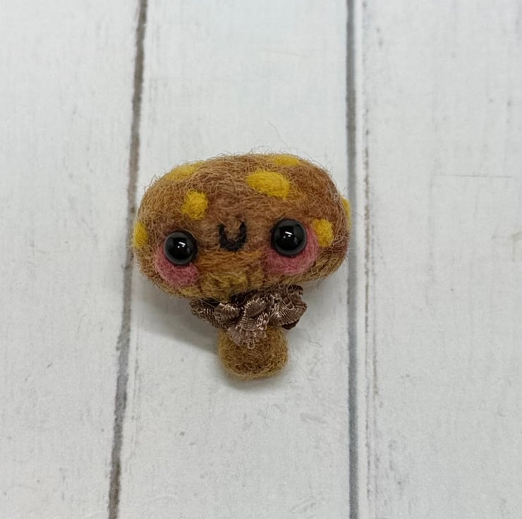 A tiny needle felled mushroom with multi tonal brown cap and yellow spots. Mushroom has glass bead eyes and rosy cheeks with hand embroidered gills and ruffled ribbon atop the stem. Measures roughly 3cm tall and comes with transparent loop hanger. This is for decorative purposes only and not a toy. Tracking available in separate listing.