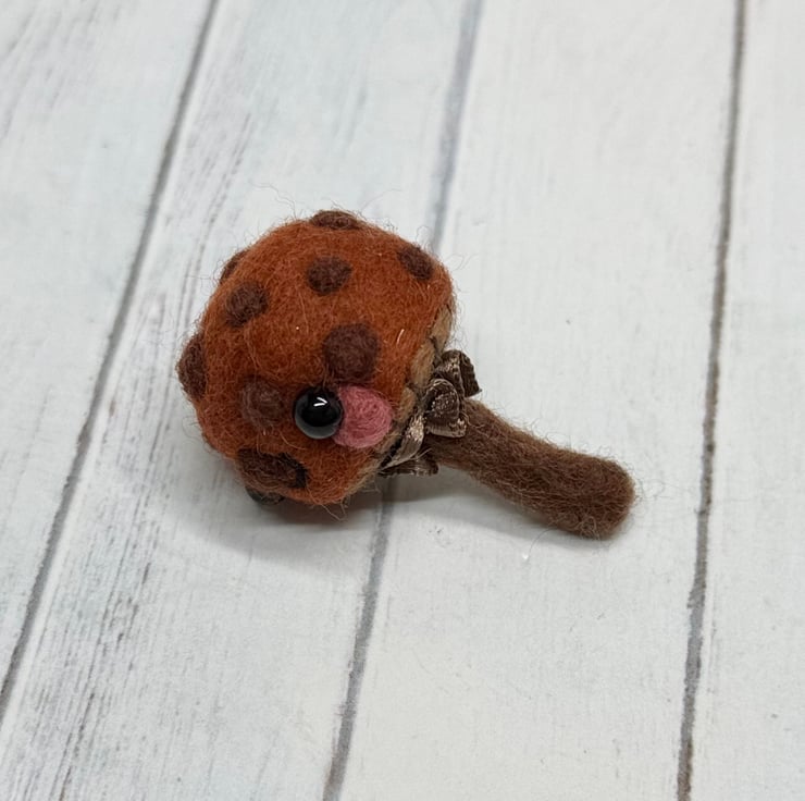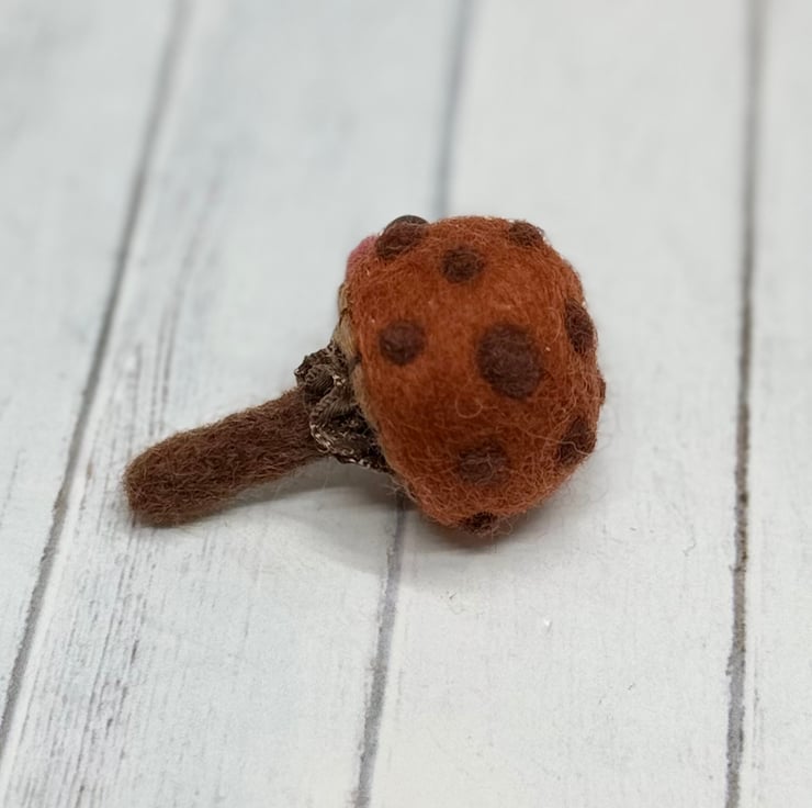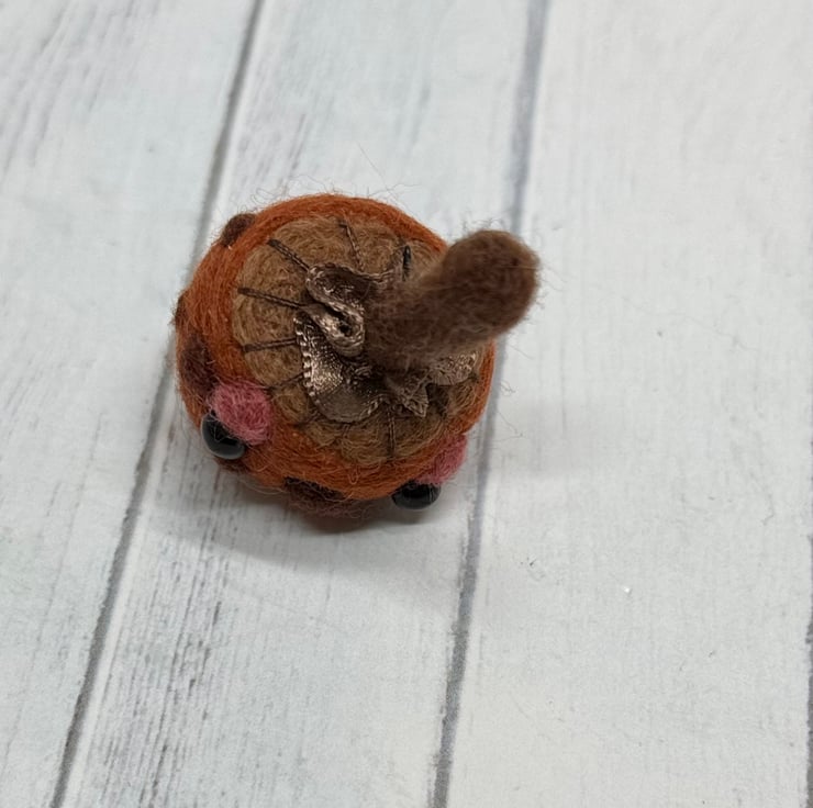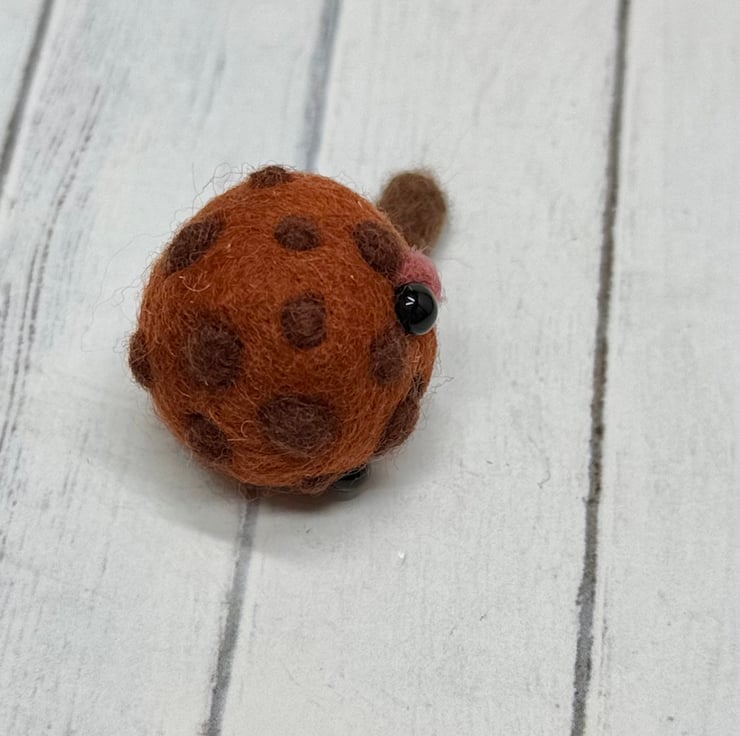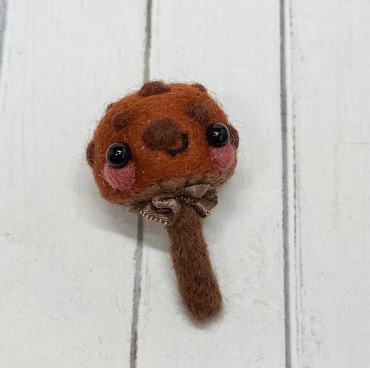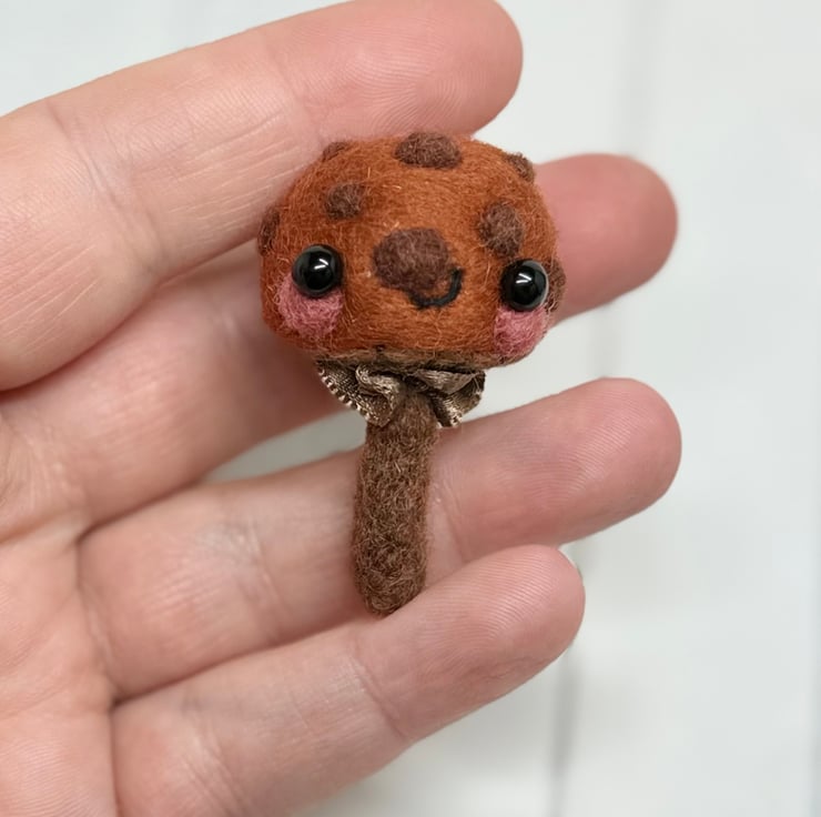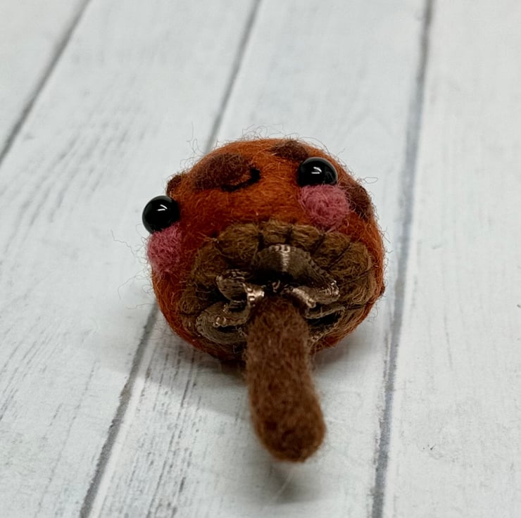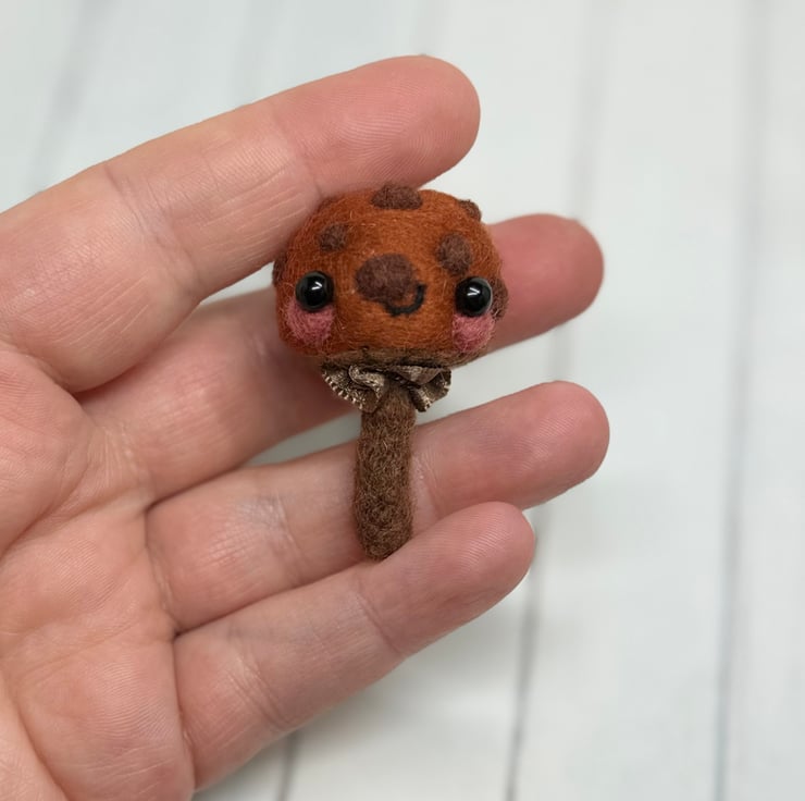 A tiny needle felled mushroom with chestnut cap and brown spots. Mushroom has glass bead eyes and rosy cheeks with hand embroidered gills and ruffled ribbon atop the stem. Measures roughly 5cm tall and comes with transparent loop hanger. This is for decorative purposes only and not a toy. Tracking available in separate listing.