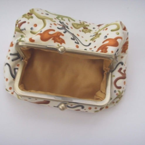 Perfect little clutch for your mobile phone, keys, sunglasses,change and credit cards or even a make-up bag. Pretty colourful cats fabric with contrasting lining, padding and metal frame clasp.