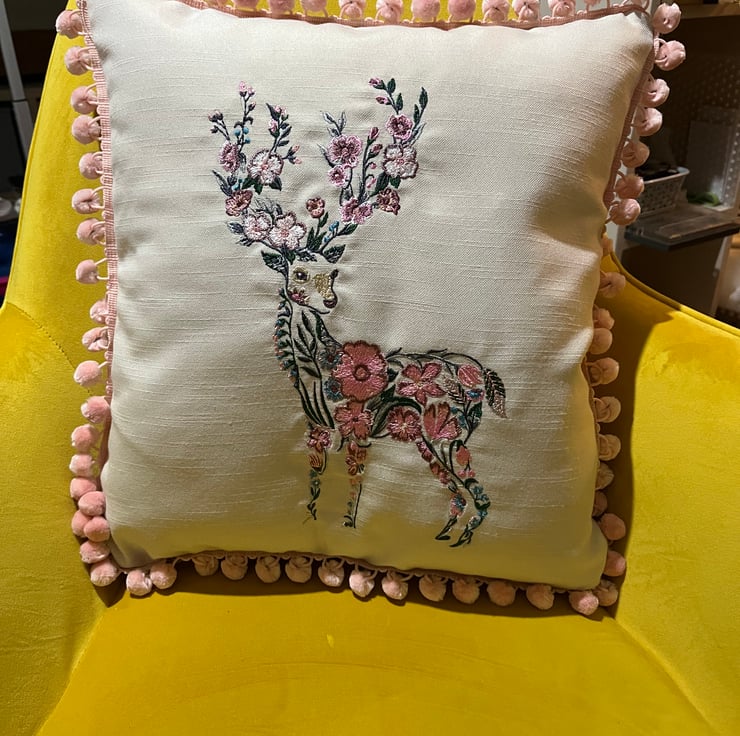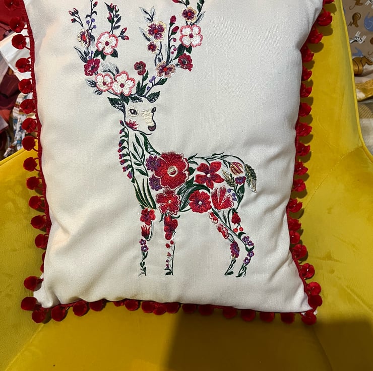 Linen cushions with embroidered floral animals pattern. Edged with Pom Pom trim.