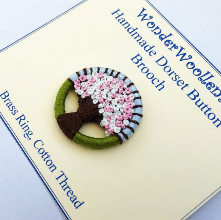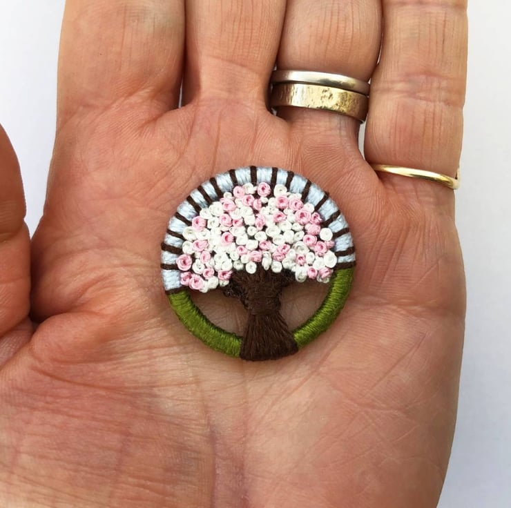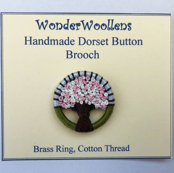 I made this ‘Sakura’ (cherry blossom) brooch using traditional Dorset button techniques, of working cotton and silk thread on a brass ring. The blossom tree is set against a pale blue sky and green grass foreground.