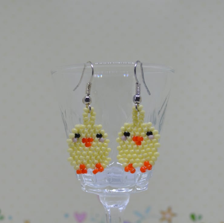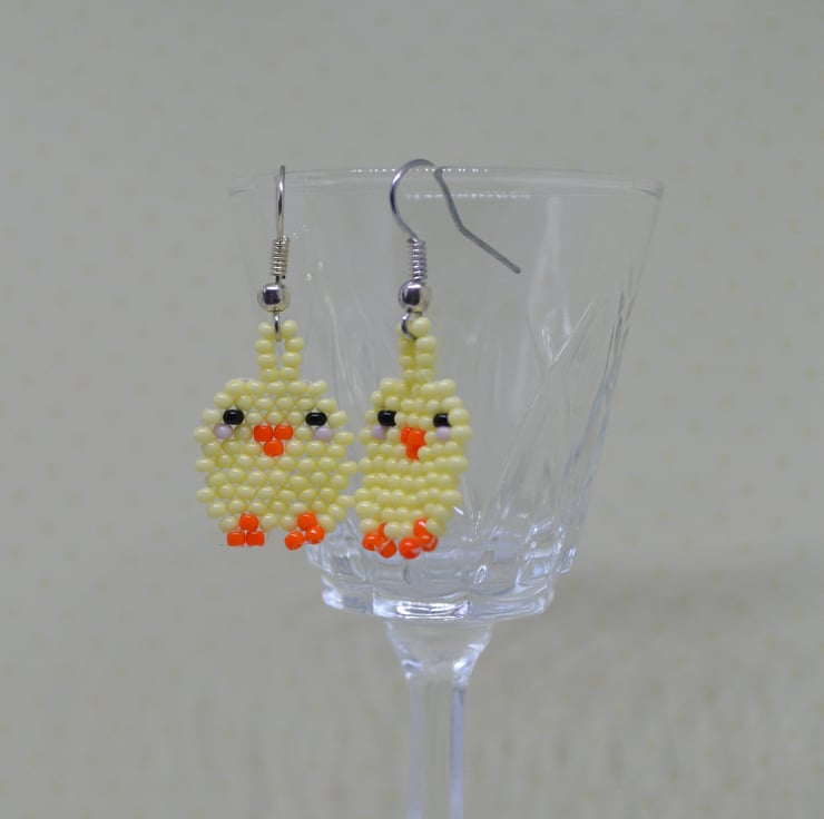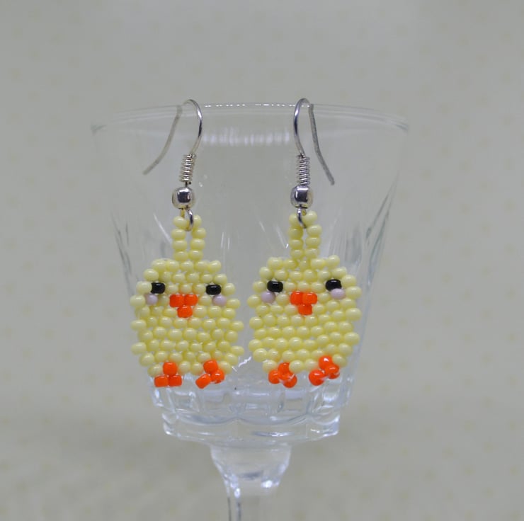 These cute Easter chick earrings are made using pale yellow Czech seed beads. I think these seed beads give the chicks a "fluffy" effect. They are approx. 2.2cm from the base of the silver plated ear wires and are approx. 1.5cm wide.