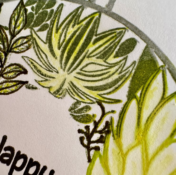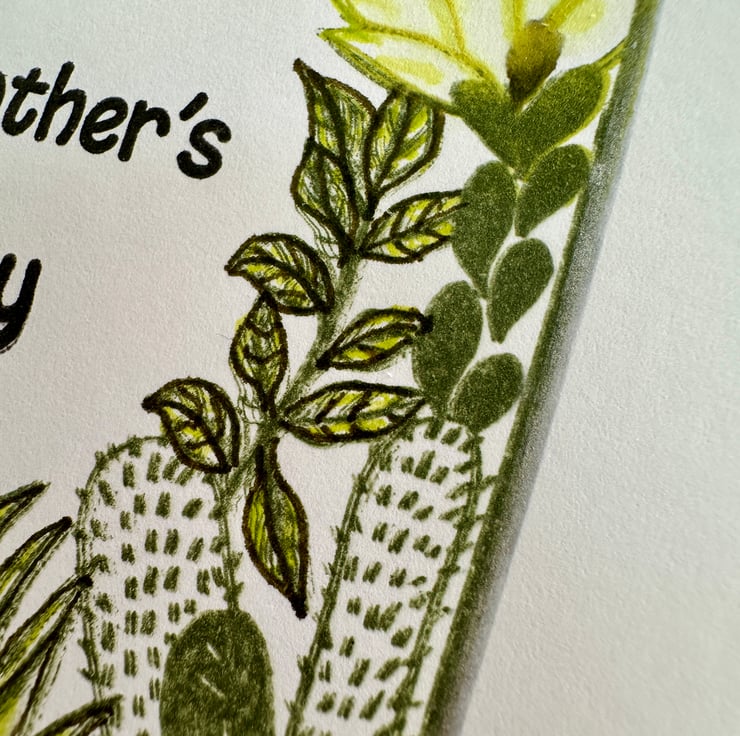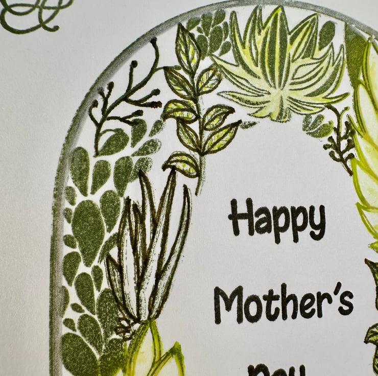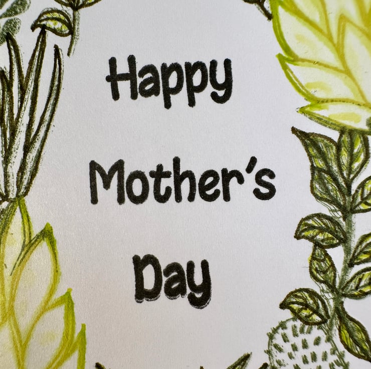The message “Happy Mother’s Day” sits centrally amongst them in a black archival ink 300gsm heavy card stock has been used with a thick plain white insert for your own greeting and comes with a green envelope.
