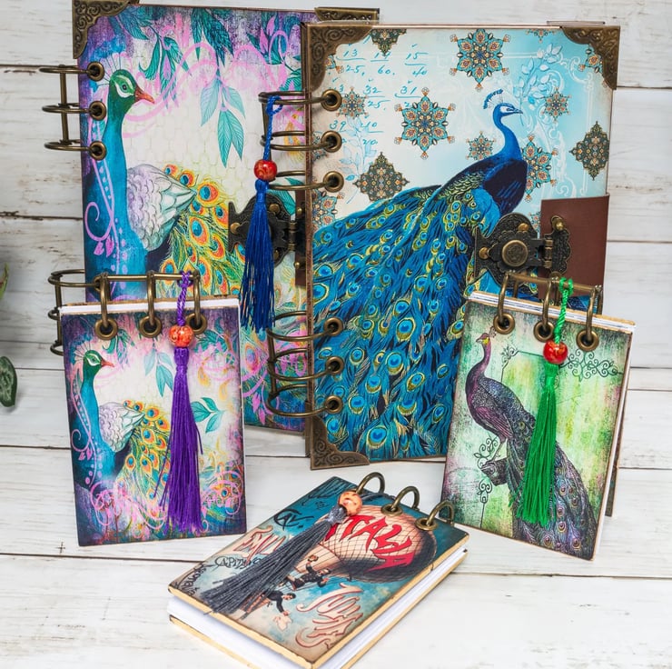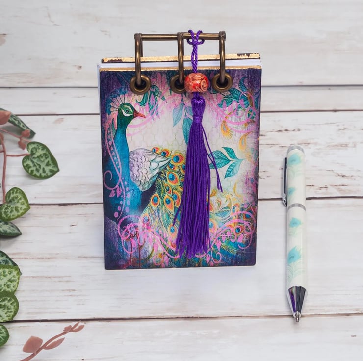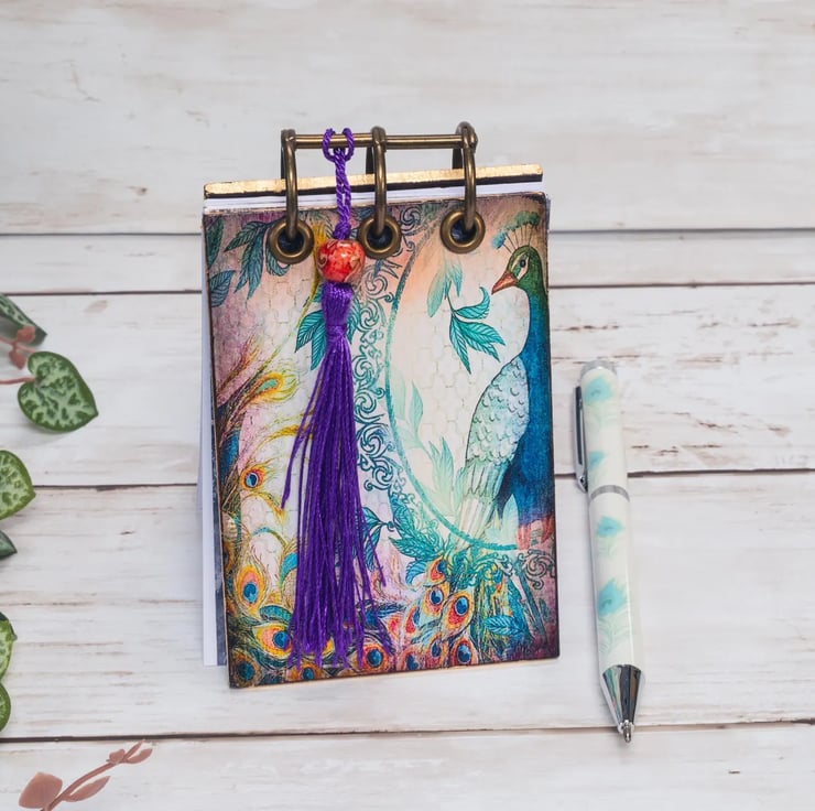 Beautiful vintage boho style pocket notepad, made to last with wooden covers and decoupaged with purple peacock prints. This mini notebook is A7 in size and slips into a back pocket, bag or purse making it perfect for quick notes, shopping lists, flash cards folder etc. When not being used it can stand on a desk or shelf like a mini billboard, looking exceedingly pretty and highly decorative. They also make fantastic mini photo albums and are great for gifts and wedding favours.