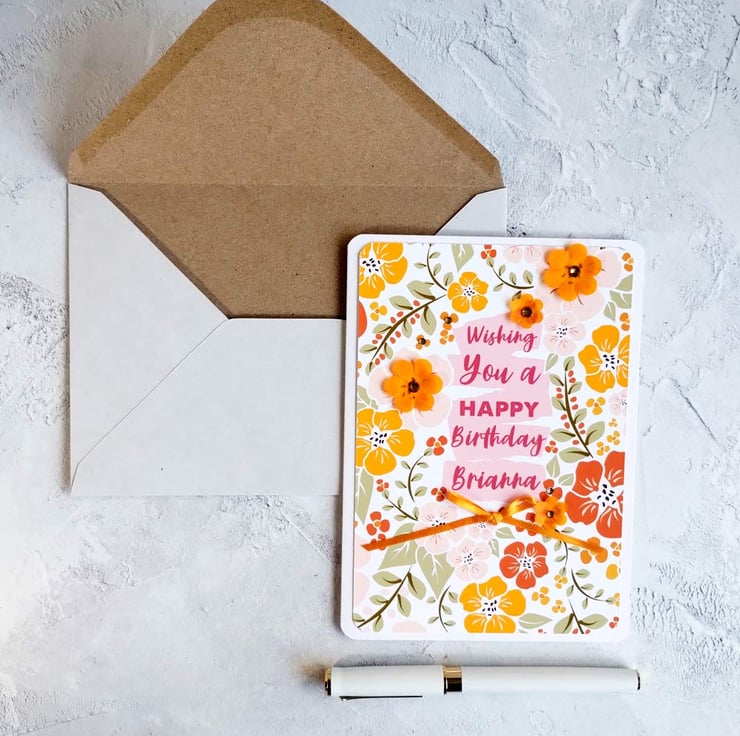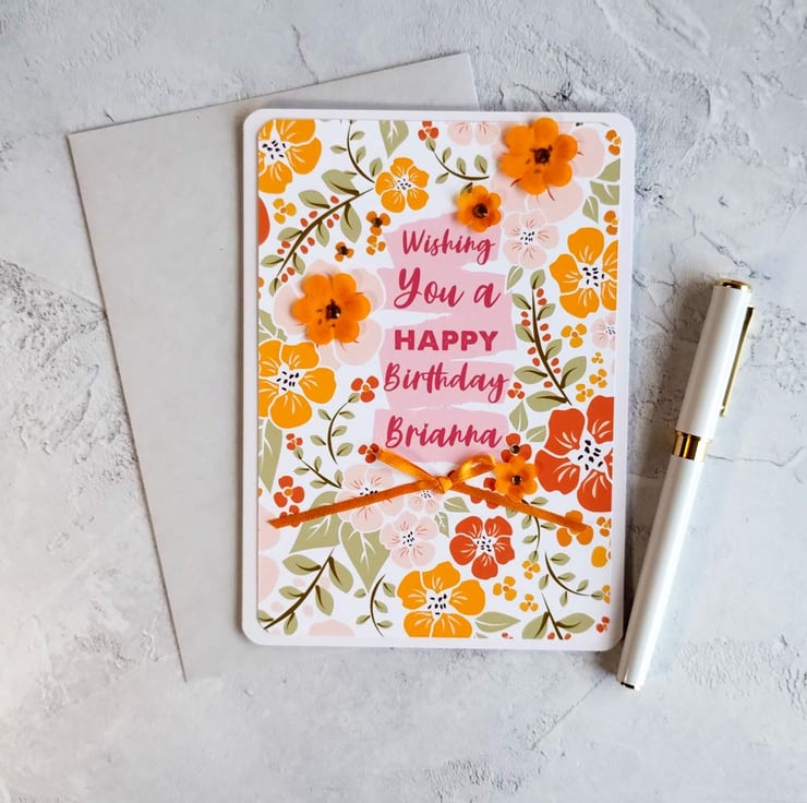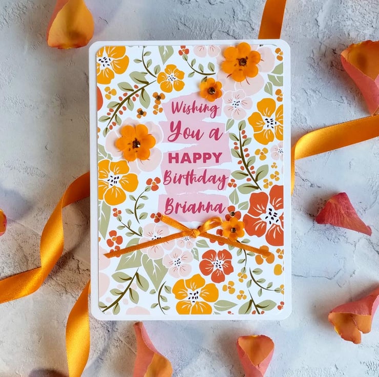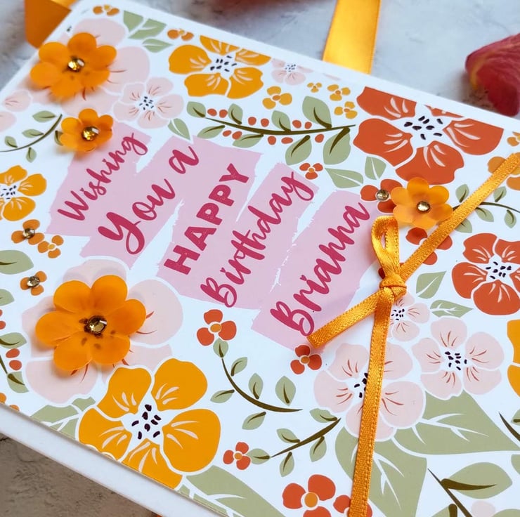 This bright 5x7 inch personalised birthday card is made from 300gsm card, embellished orange vellum cutout flowers with rhinestone centres and finished with a hand-tied bow.