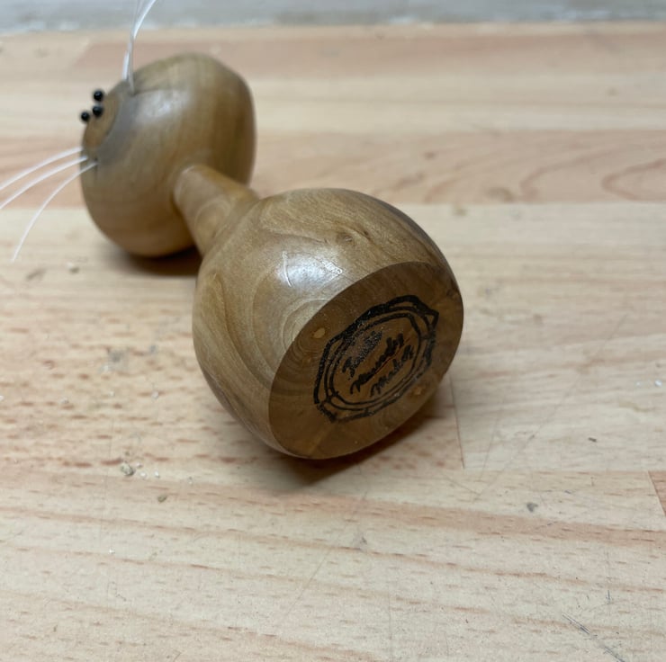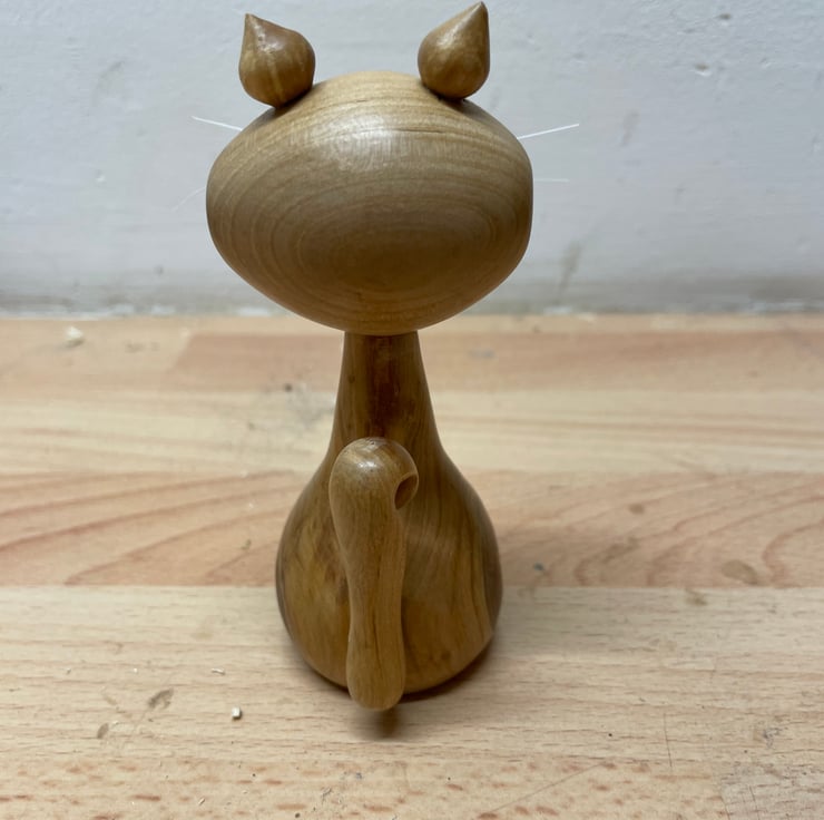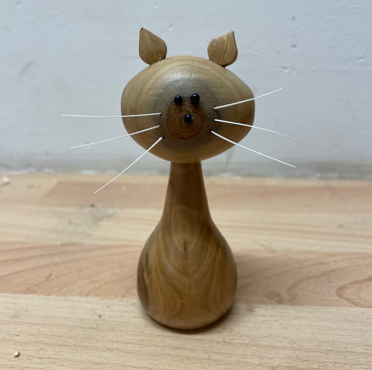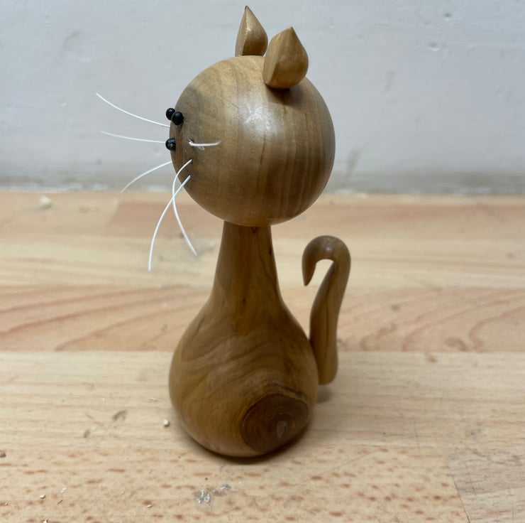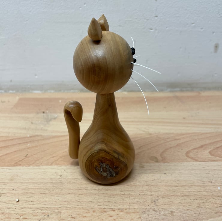 This bespoke cat is made from a neighbours apple tree that had to be felled before it fell down. Wood has been home seasoned for 2 years and then turned on a lathe into this beautiful cat, the head, body, tail and both ears have all been turned separately, the tail requiring hand shaping. The whiskers are made from feathers and the eyes are glass.