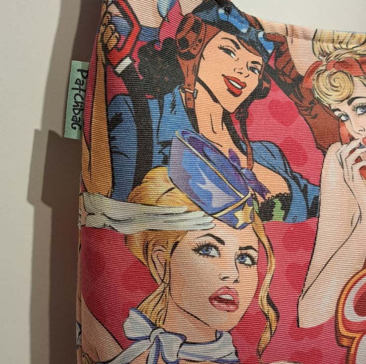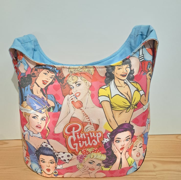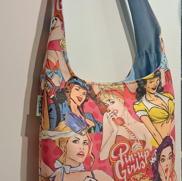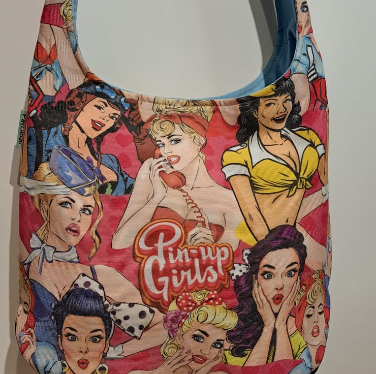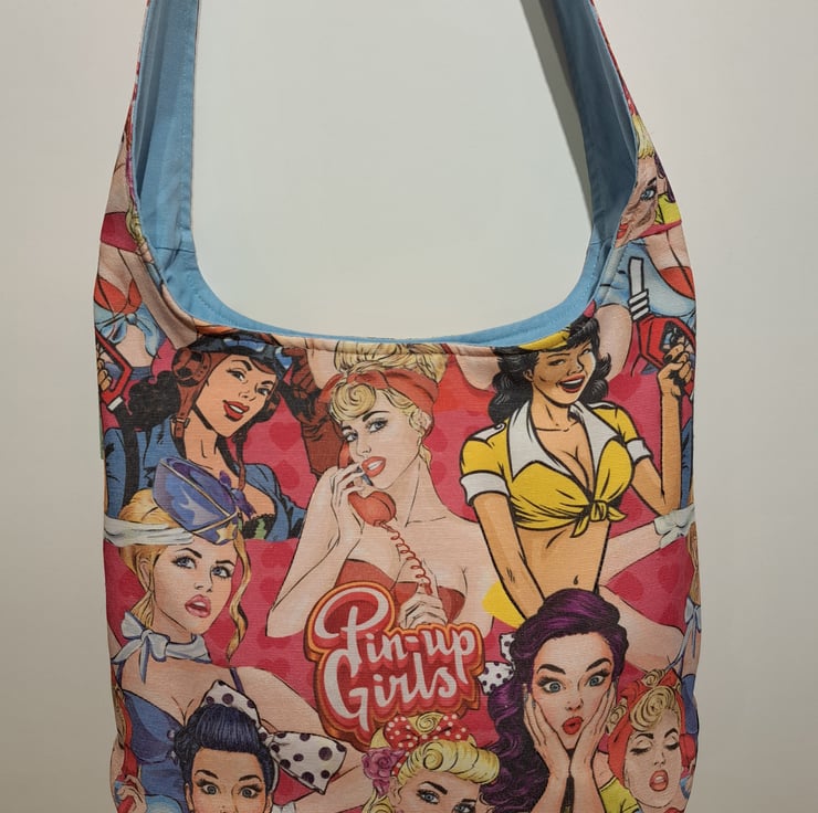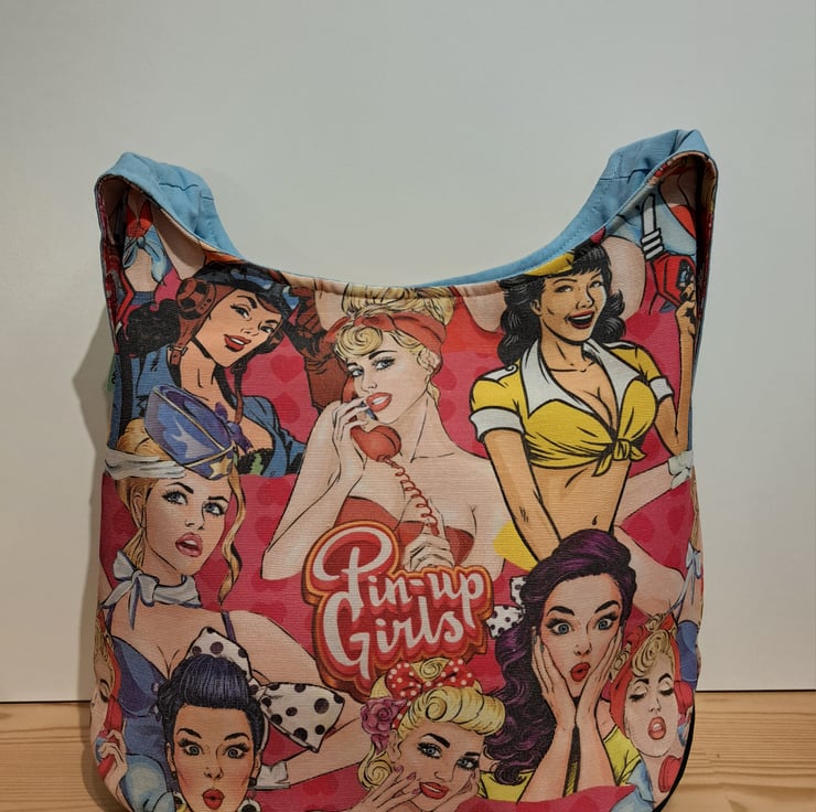 Big canvas hobo style shoulder bag with colorful retro girls pattern. The bag lined with