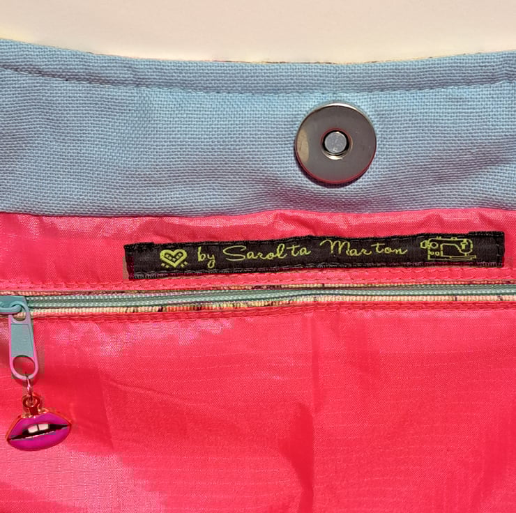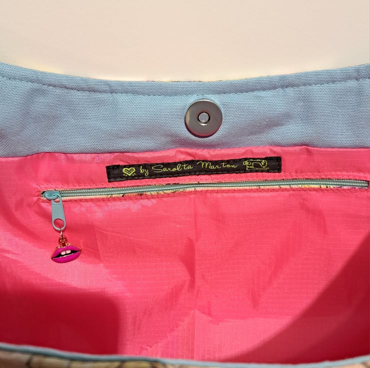 bright pink waterproof fabric, has inner pocket with zip closure. The handbag closing with magnetic button. The main colors of the pattern are red,pink,blue and yellow. The shoulder strap is not adjustable, not suitable for crossbody, only for shoulder bag. Lenght of the stap is 84cm. The size of the bag is big enough for daily shopping or going to work. Very comfortable to wear. Dimenions of the bag: hight 30cm, width 37cm,depth on the bottom of the bag:11cm.