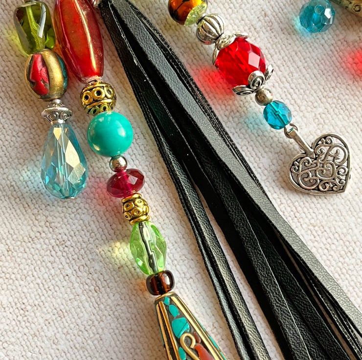 I've used a selection of glass beads as well as a semi-precious Turquoise bead and a large feature Tibetan bead with red coral and Turquoise chips.