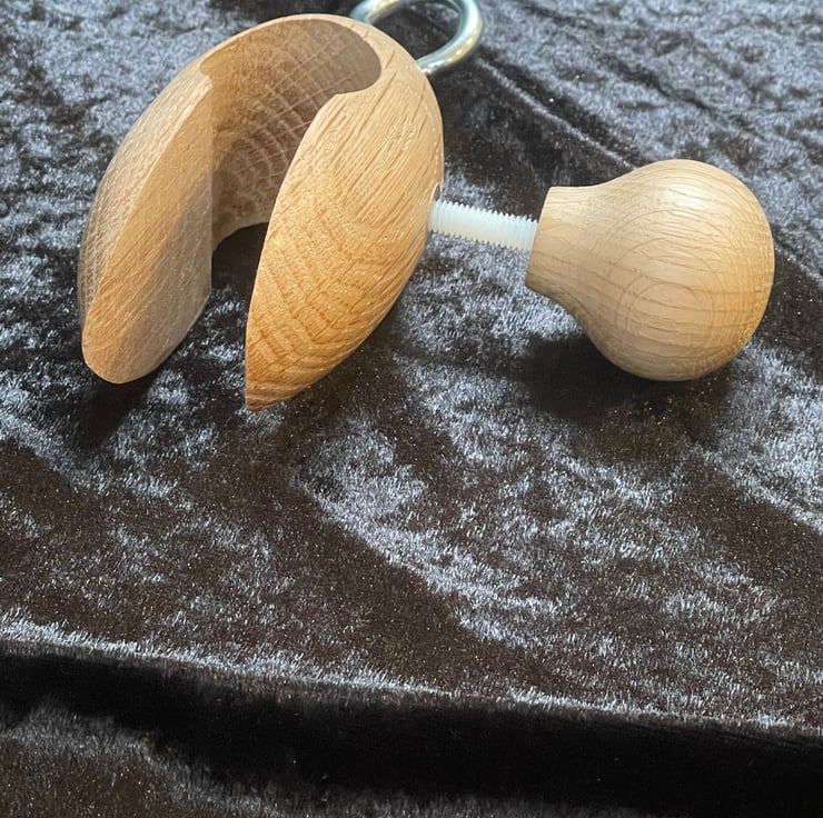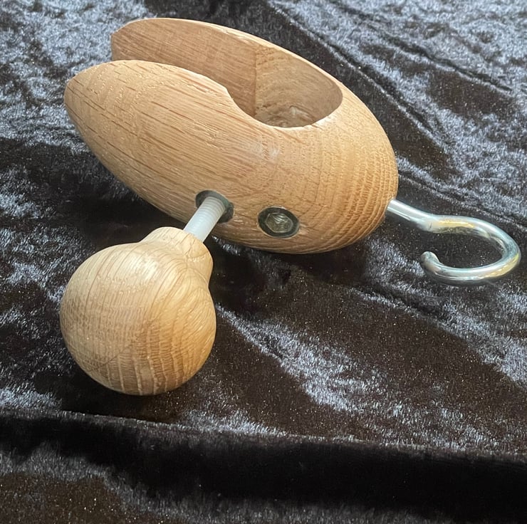 A simple device that slips onto a bowl or similar , it's secured by a nylon knob and the hook guides your wool.. Crafted out of Oak it will accept a bowl rim of 20mm thickness max. This one has a choice of knob locations if needed