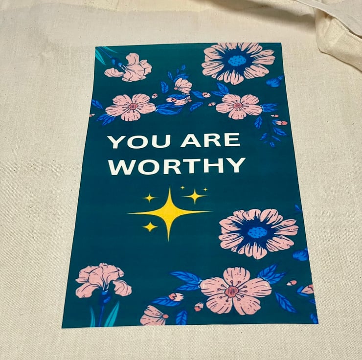 Handmade One of a kind Tote bag with quote. This cotton bag is ideal for those who like a lightweight bag which rolls or folds easily into small spaces till needed. The design of pink flowers on a dark blue background with the odd green leaf has a central quote... "You are worthy". Ideal to gift to someone who may need to hear this or maybe keep for yourself.