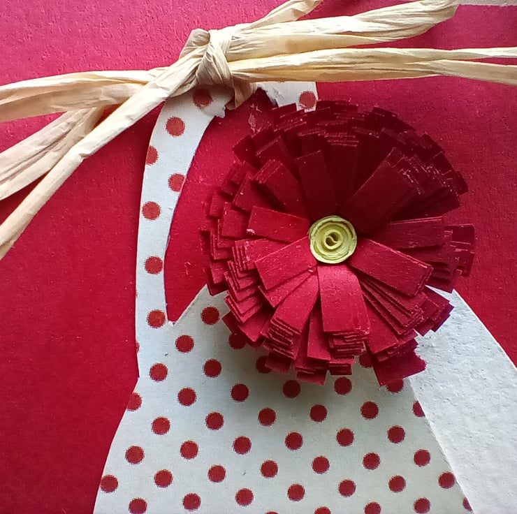 This card was made using a brown kraft card, patterned papers, quilling paper and plain raffia (string). The greeting is printed on white card in red ink. The card is finished with small heart shapes.