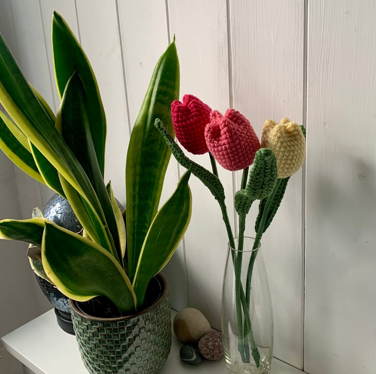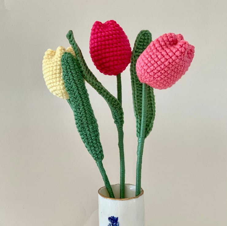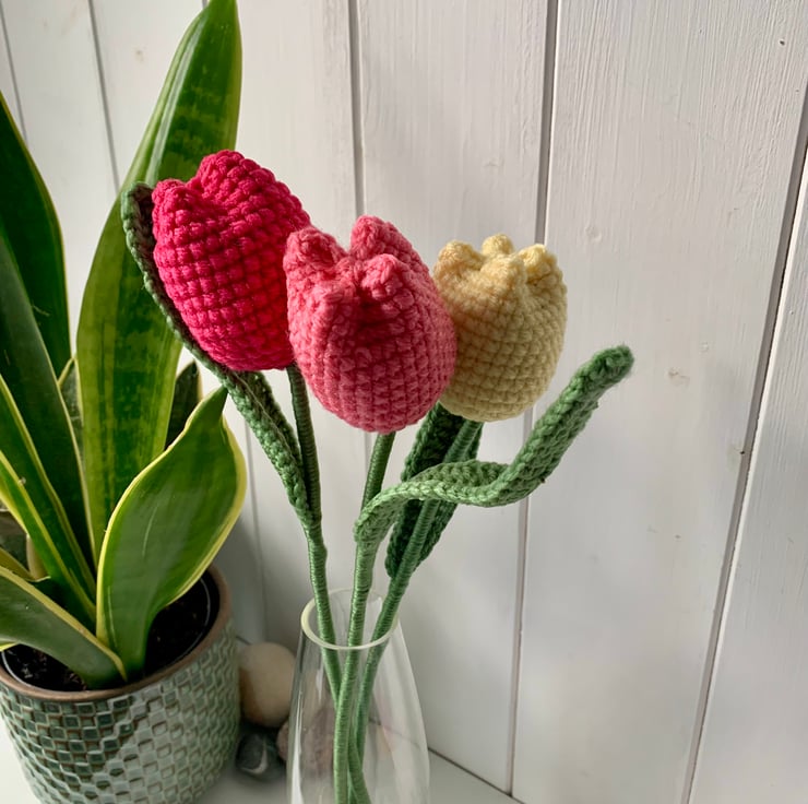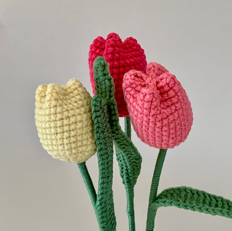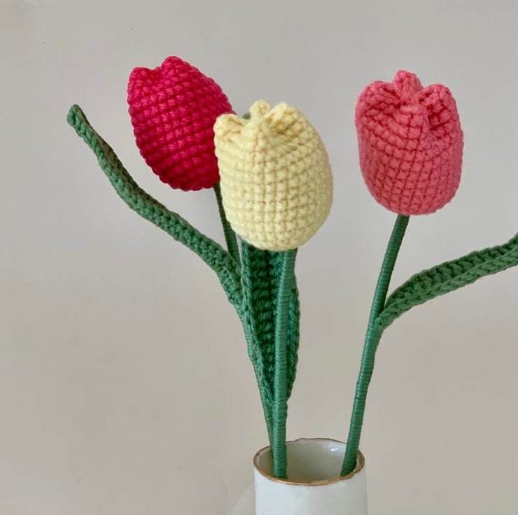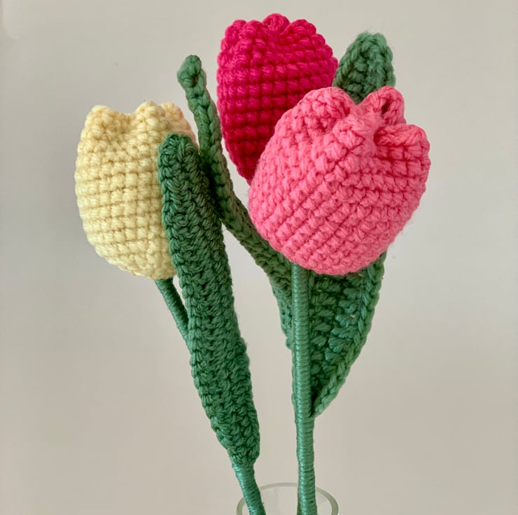 crochet tulip mini bouquet. This bouquet consists of 3 tulips in lemon, salmon pink and deep pink. An everlasting gift.