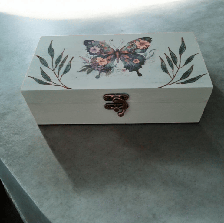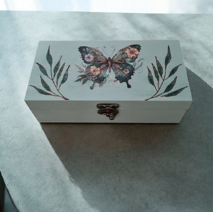 Wooden keepsake/storage box painted with chalk paint and decoupaged with a beautiful butterfly.