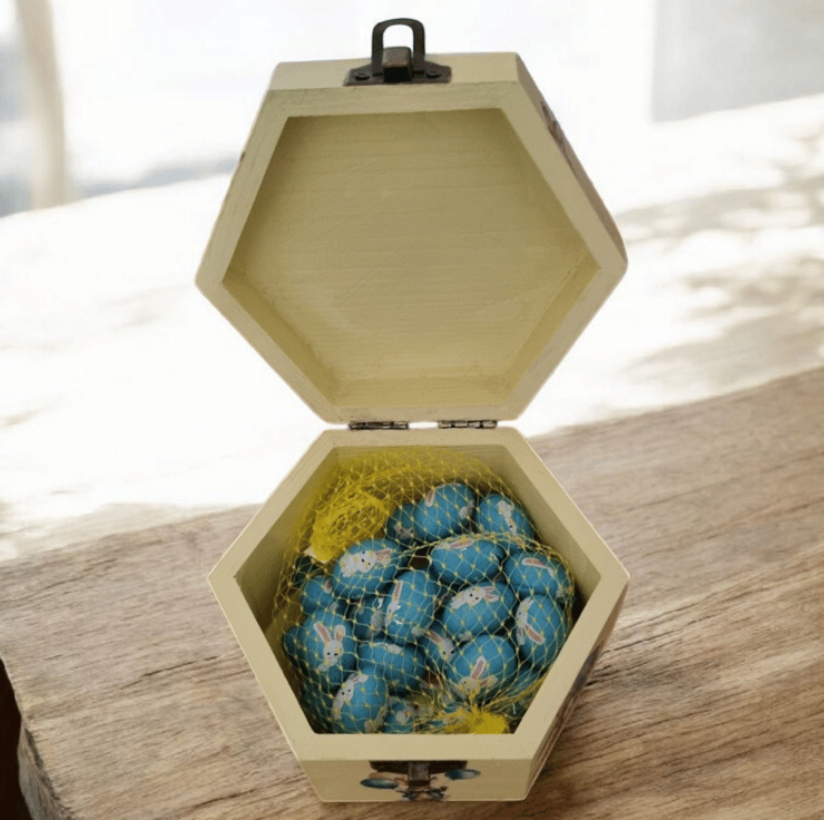 This comes with a small bag of solid milk chocolate eggs,the perfect Easter gift for that special someone and can be used as a keepsake box after.